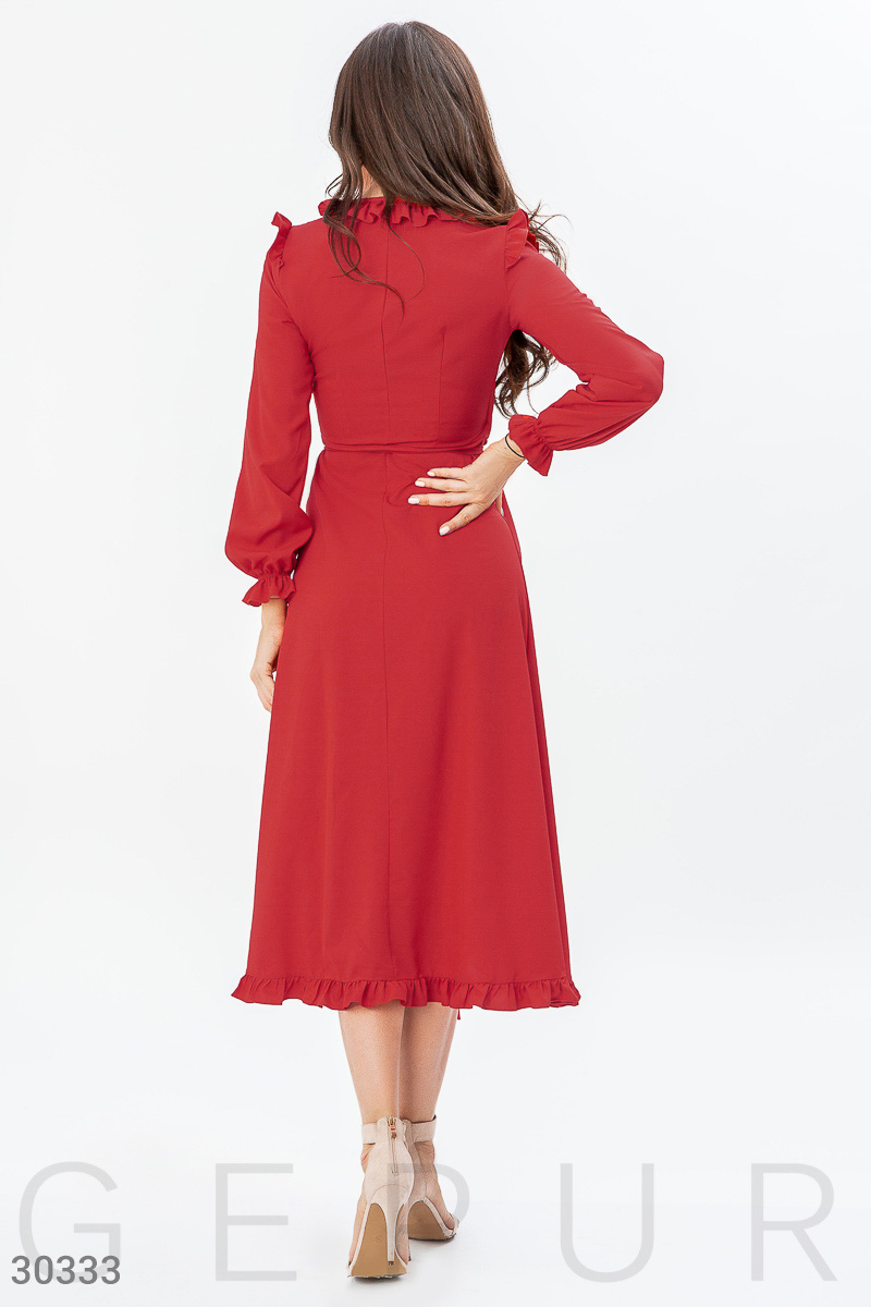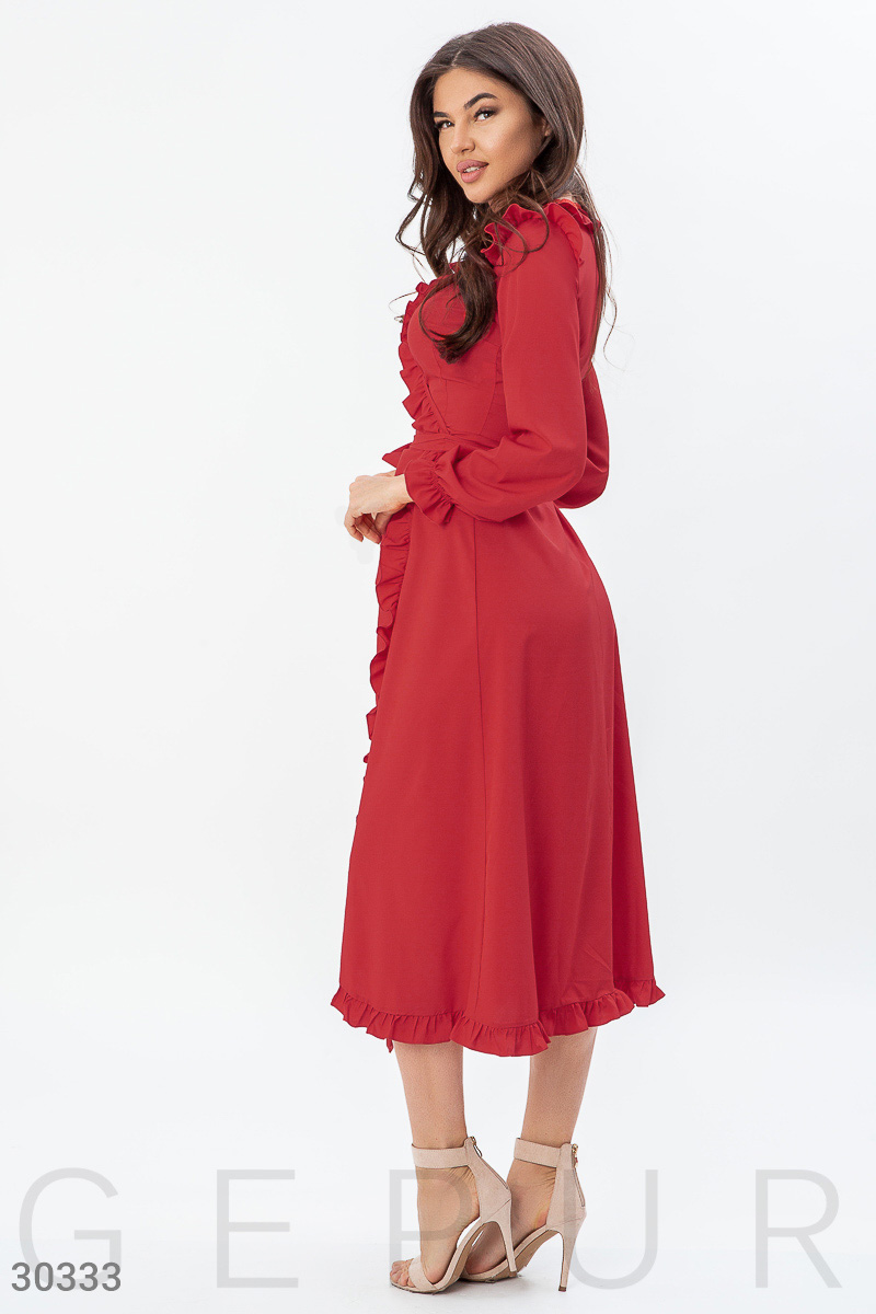 Повседневное длинное платье на запа́х, декорированное изящными оборками, с длинным рукавом на эластичной манжете.