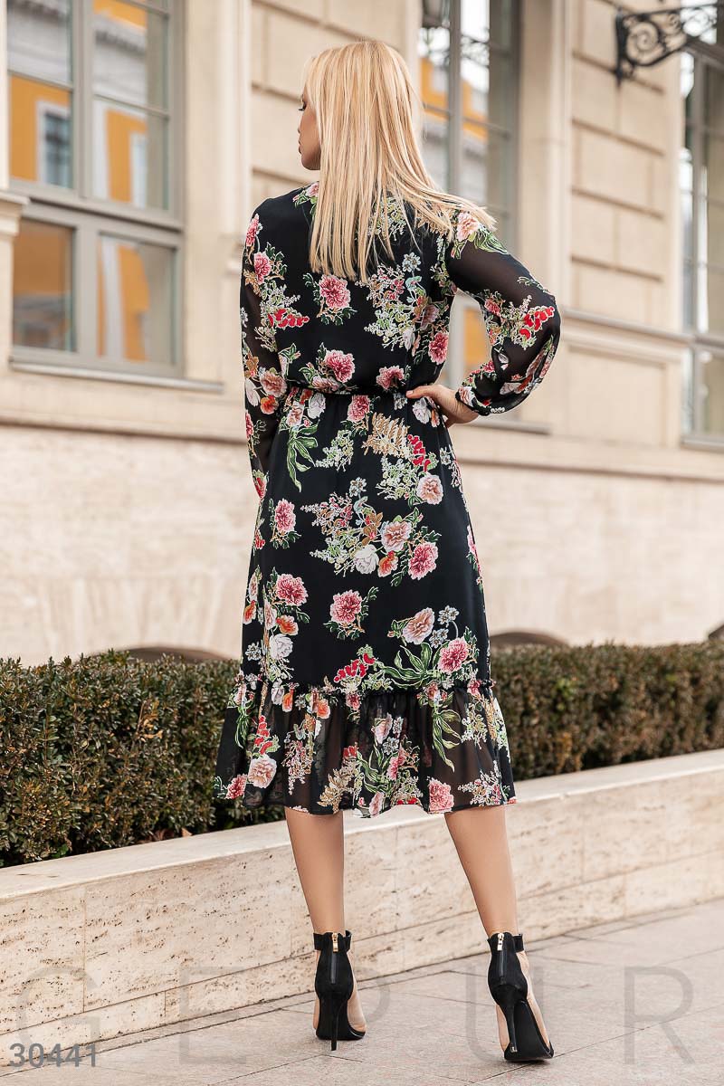 Воздушное платье-миди из невесомого шифона: аккуратный воротник-стойка с рюшами и бархатной лентой, длинный рукав на эластичной манжете, отрезная талия и расклешенная юбка с воланом.