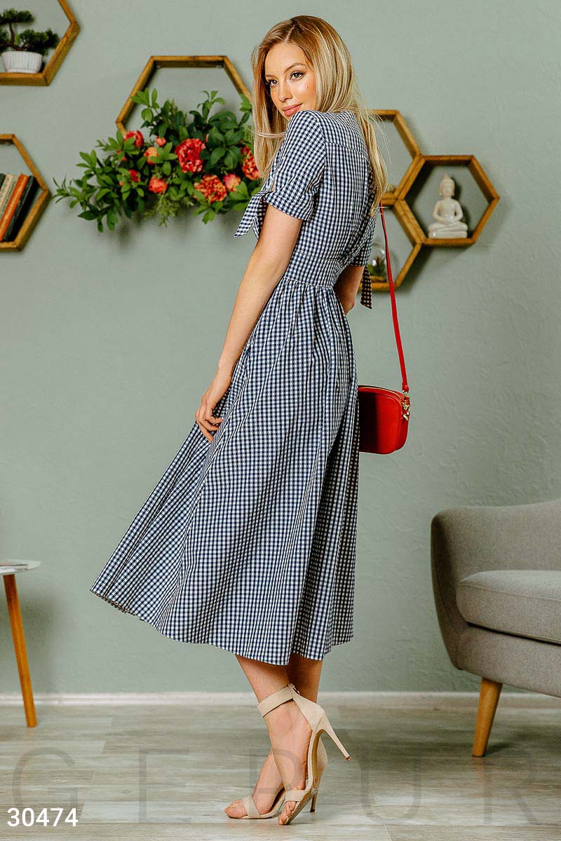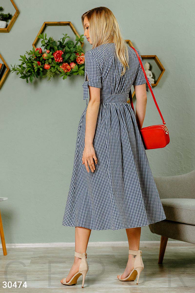 Хлопковое длинное платье в клетку: небольшой v-образный вырез, короткий рукав с завязками, широкий втачной пояс и расклешенная юбка с двумя карманами в швах.