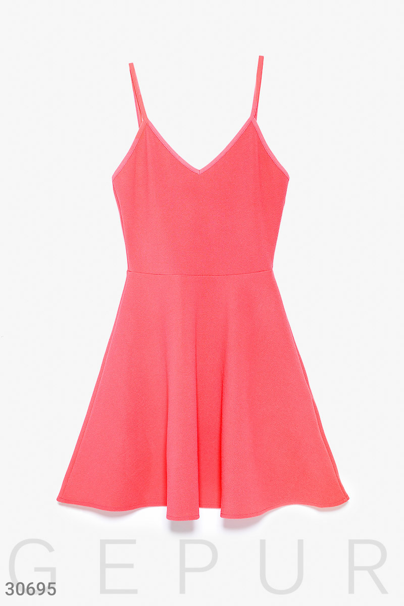 Трендовое короткое платье от дизайнеров Gepur, выполненное из мягкой ткани: тонкие регулируемые бретели, небольшой v-образный вырез, отрезная талия и короткая юбка-полусолнце.