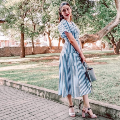 Платье-миди в полоску: небольшой v-образный вырез, цельнокроеный рукав, отрезная талия и расклешенная юбка с двумя накладными карманами, дополненная поясом в тон.