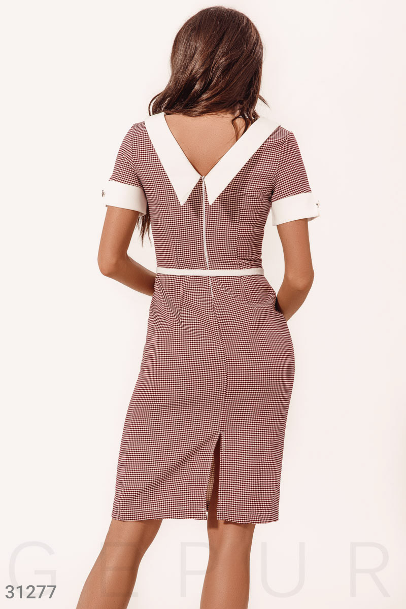 Актуальное платье-миди в клетку с вырезом-лодочка спереди и небольшим v-образным сзади, декорированным контрастным воротником, короткий рукав с широкой манжетой и декоративной пуговицей, отрезная талия и облегающая юбка с двумя прорезными карманами и разрезом сзади, дополненная тонким ремнем из эко-кожи.