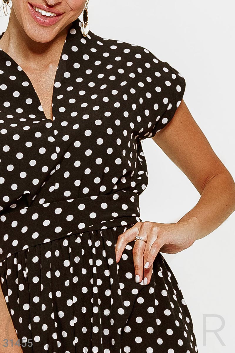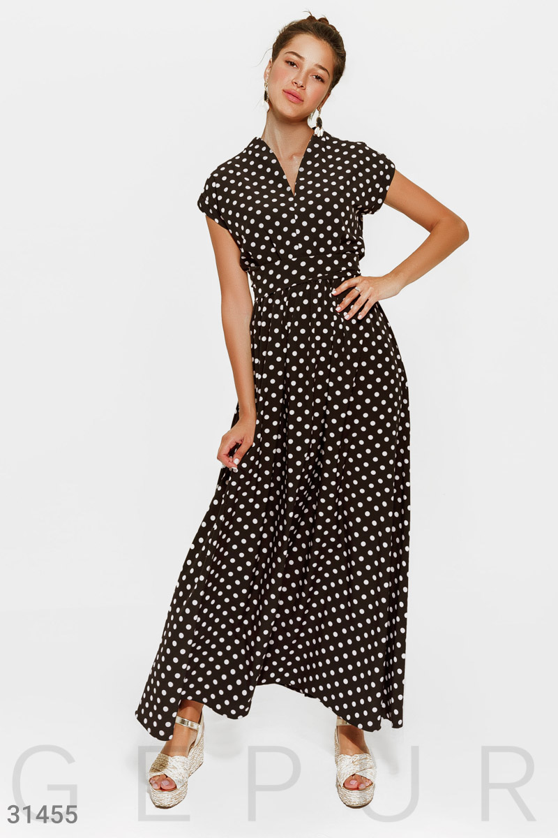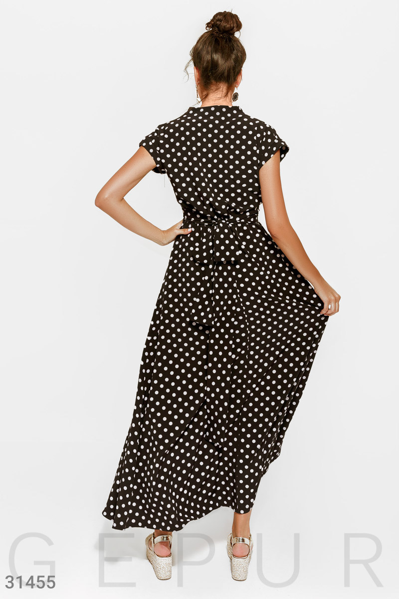 Удлиненное платье в контрастный гороховый принт: воротник-стойка, v-образный вырез, цельнокроеный короткий рукав, эластичная вставка на талии и расклешенная юбка , дополненная широким поясом в тон.