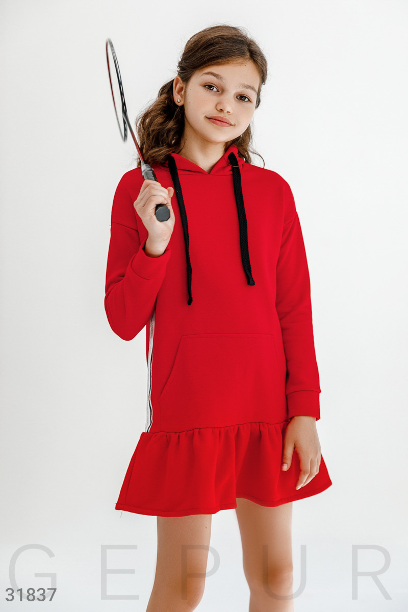 Спортивное детское платье свободного кроя: капюшон на завязках, длинный рукав на эластичной манжете, карман-кенгуру спереди, контрастные мерцающие лампасы и невесомый волан на подоле. Акционное предложение распространяется только на розничных клиентов. .