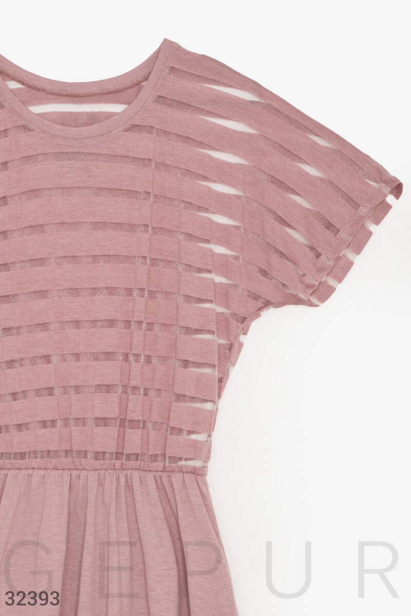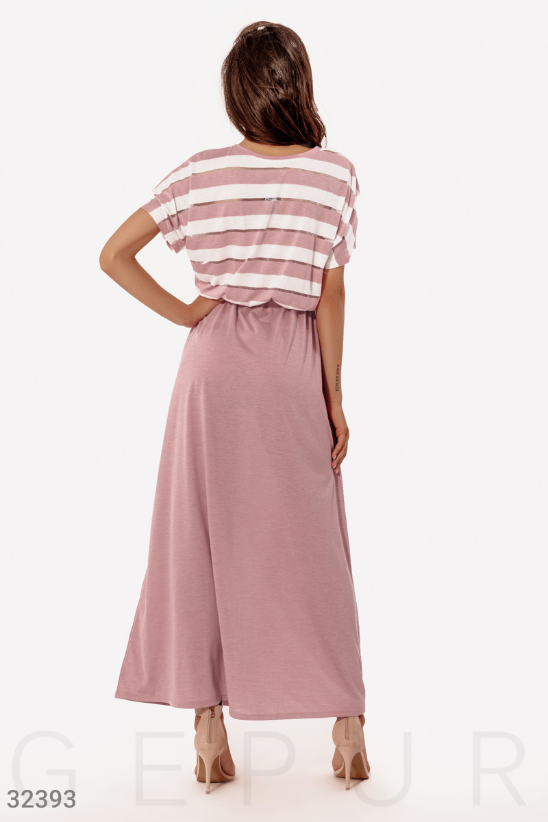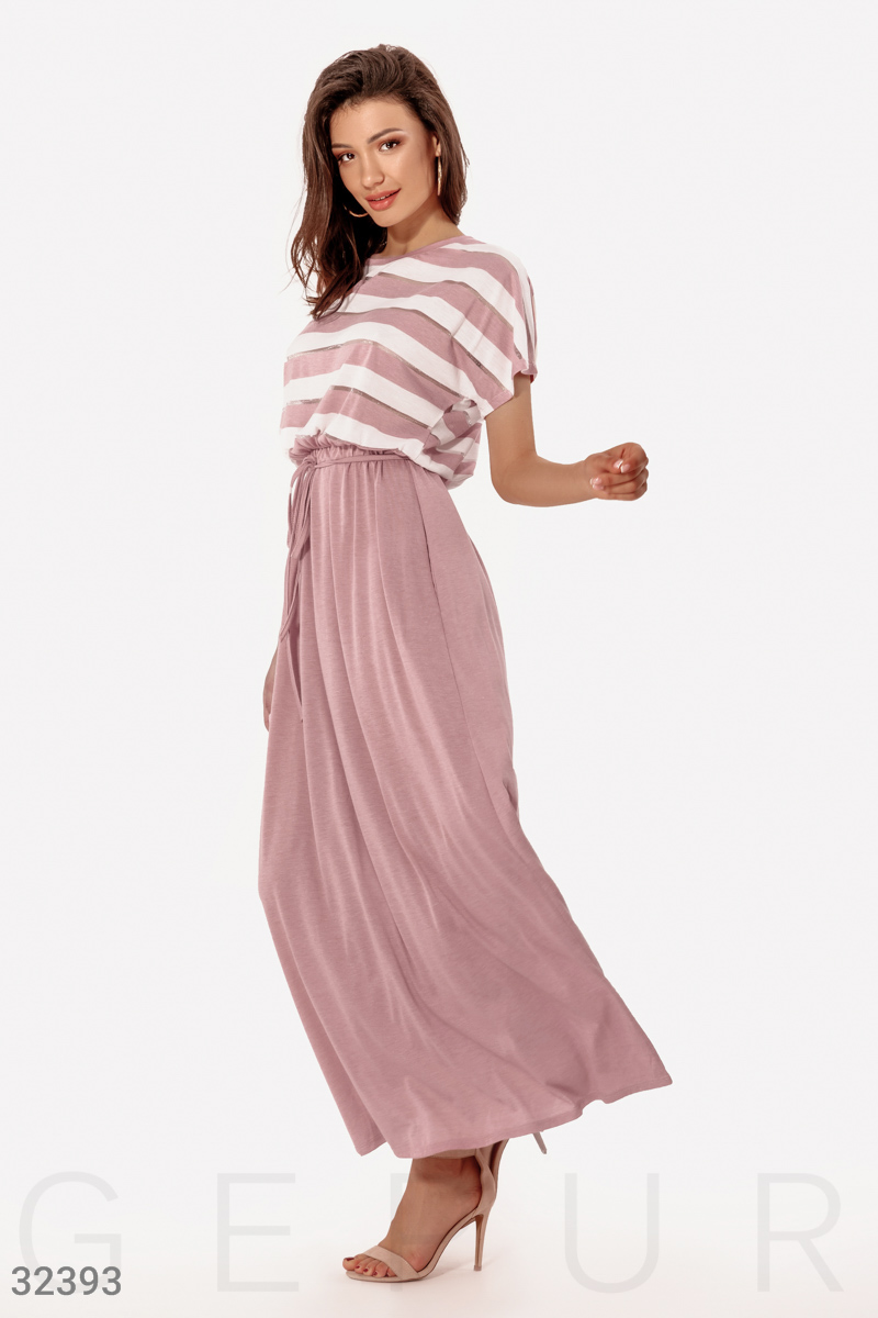Платье-макси с тонким съемным поясом, выполненное из мягкой ткани: круглый вырез, цельнокроеный рукав, верх дополнен прозрачными горизонтальными вставками, эластичный пояс и расклешенная однотонная юбка с двумя прорезными карманами по бокам.