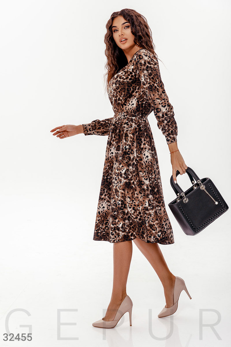 Платье-миди в леопардовый принт с круглым вырезом, длинным рукавом, отрезной талией с декоративным поясом и расклешенной юбкой.