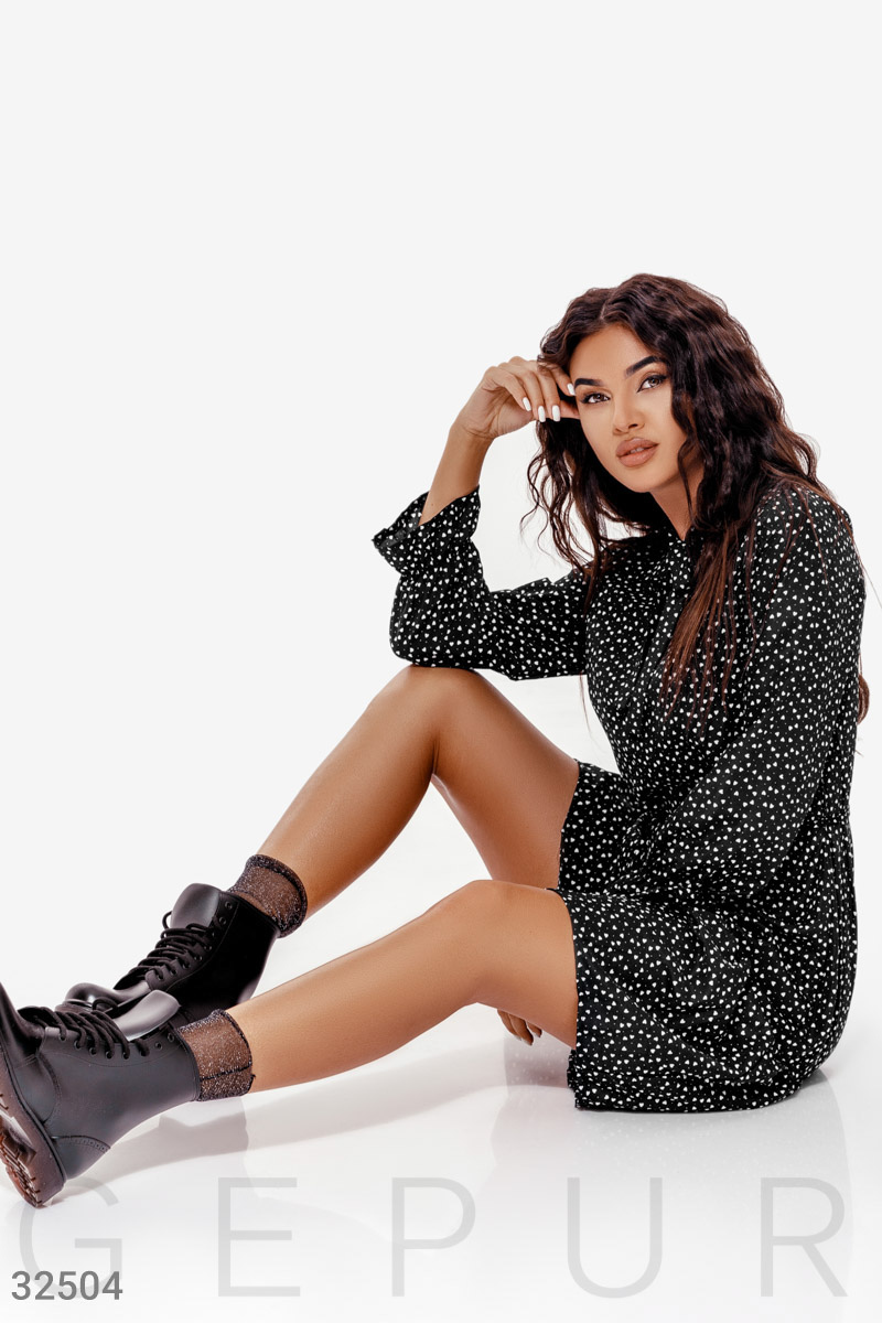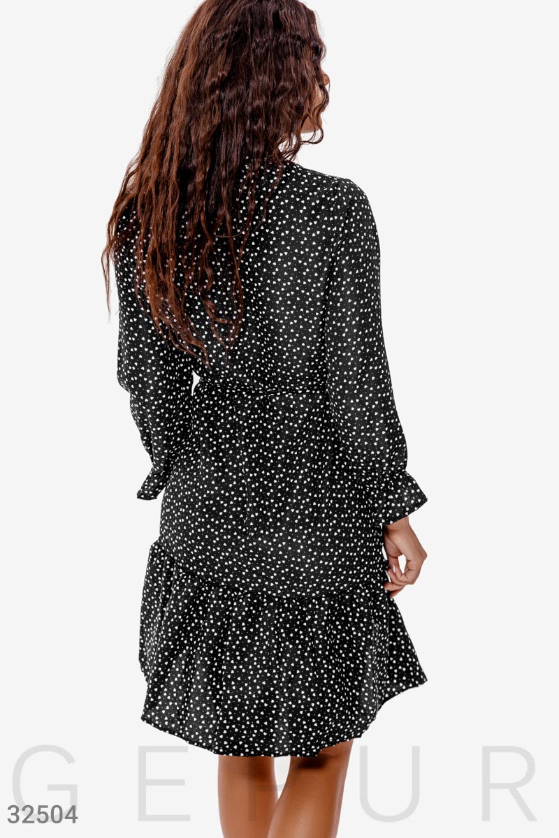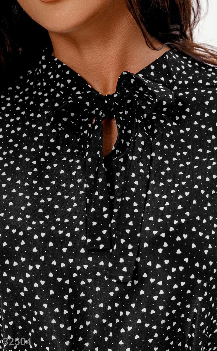Черное платье-oversize в мелкий фигурный принт с завязками на шее, длинным рукавом с эластичной манжетой, расклешенной юбкой с невесомым воланом и тонким поясом в тон.