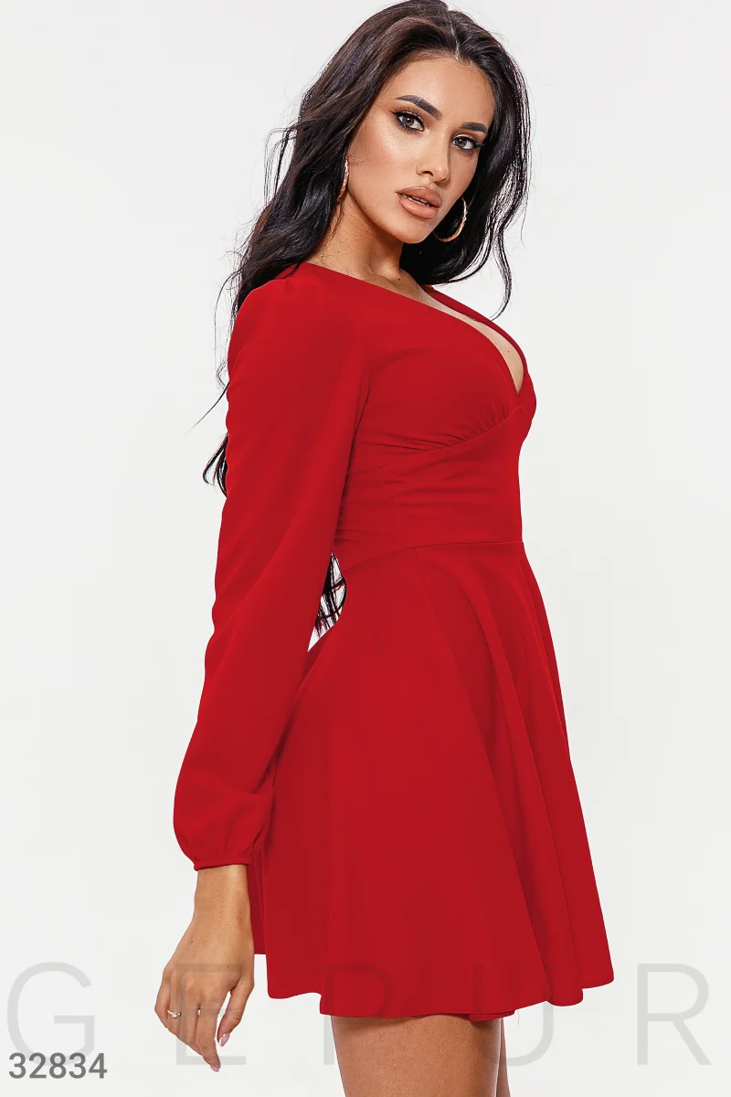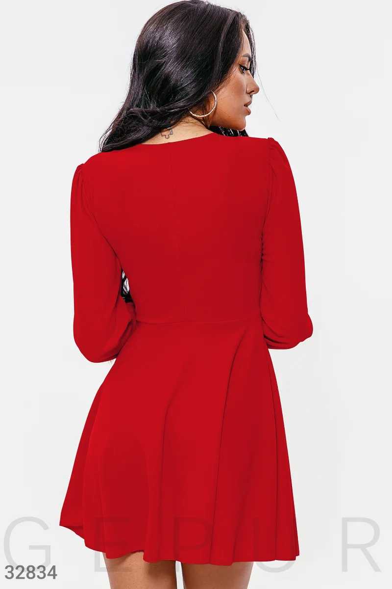 Короткое платье красного цвета: глубокий v-образный вырез, длинный объемный рукав с эластичной вставкой, широкий втачной пояс и расклешенная юбка-мини.