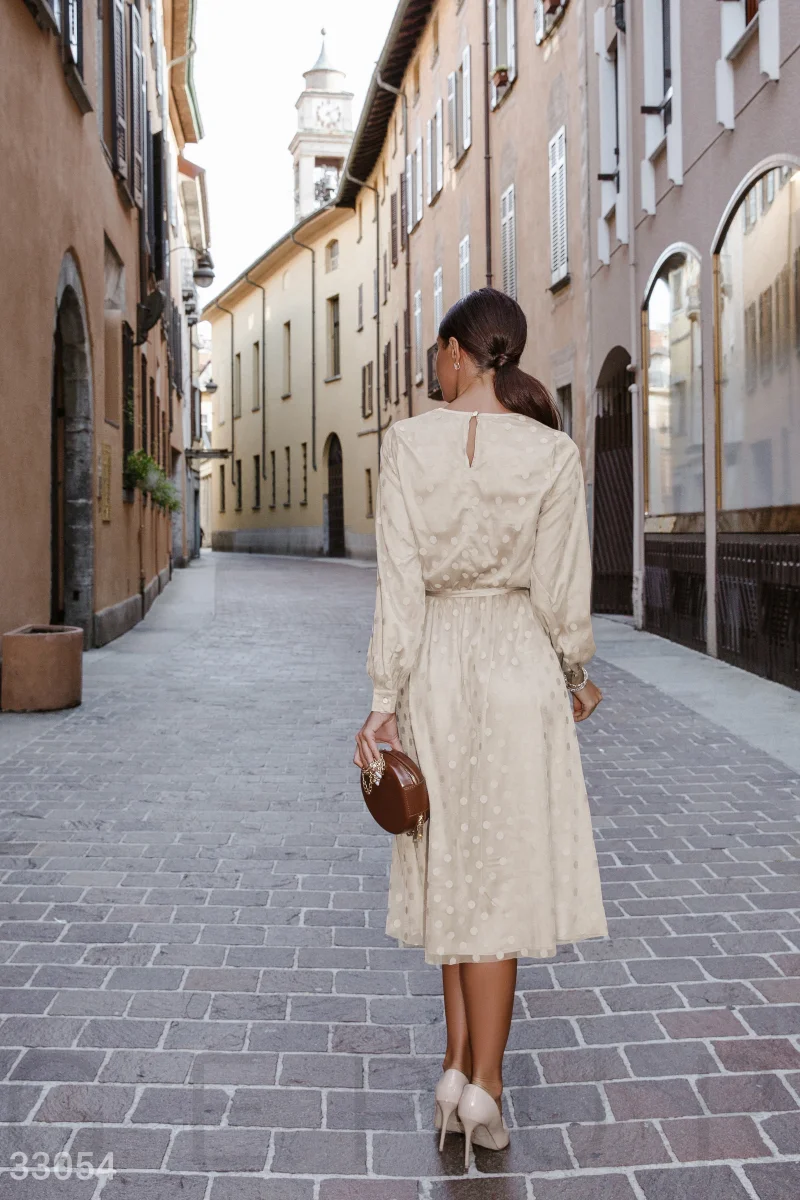 Расклешенное бежевое платье-миди на шелковом подкладе, дополненное сетчатой тканью с флоковым напылением: круглый вырез, длинный рукав на широкой манжете, отрезная талия с эластичной вставкой и юбка-полусолнце. Обращаем внимание, что платье идет без пояса.