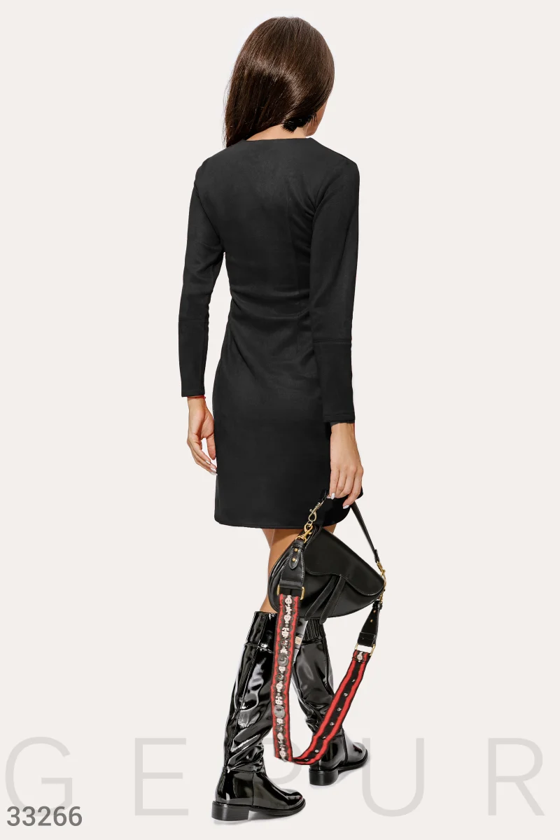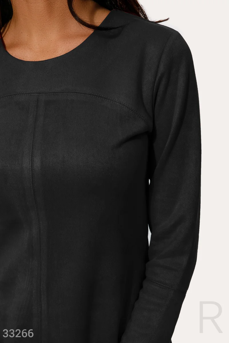 Замшевое черное платье: круглый вырез, длинный рукав и удлиненная спинка.