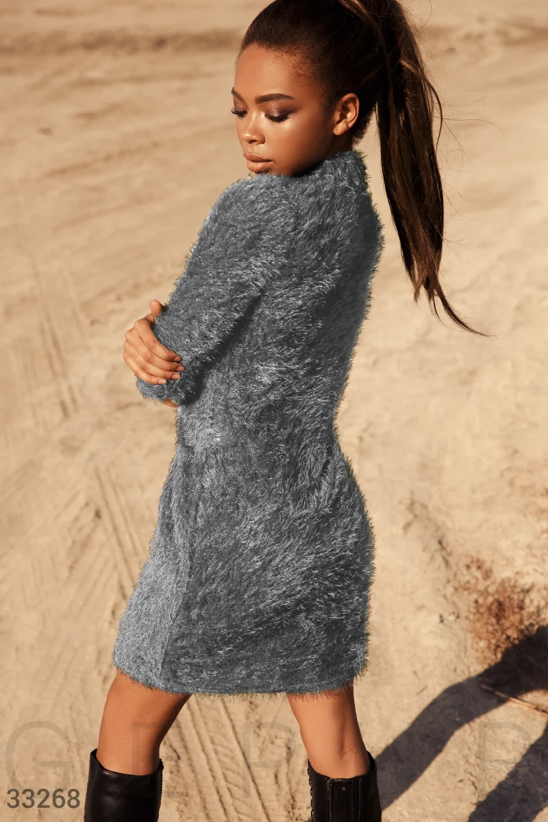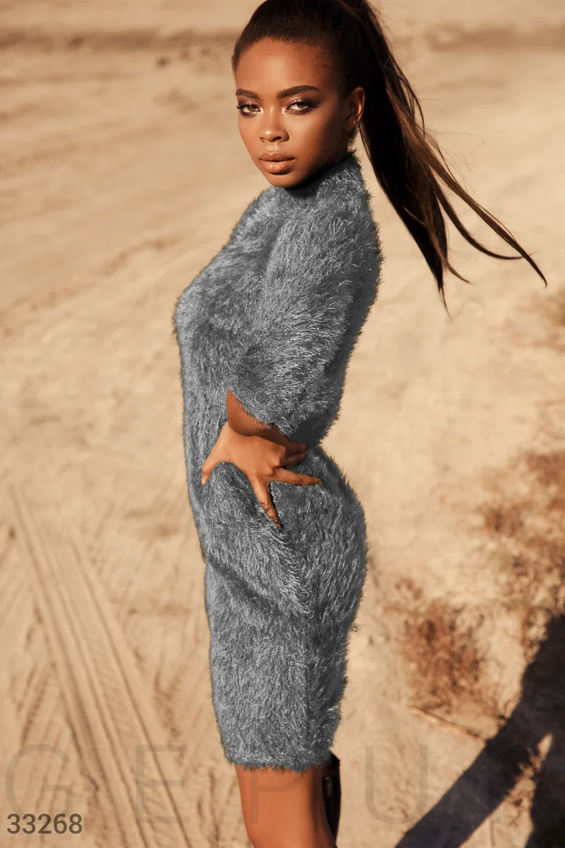 Стильное короткое платье, выполненное из трикотажа "травка": воротник-стойка, рукав 3/4 и облегающий крой.