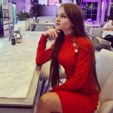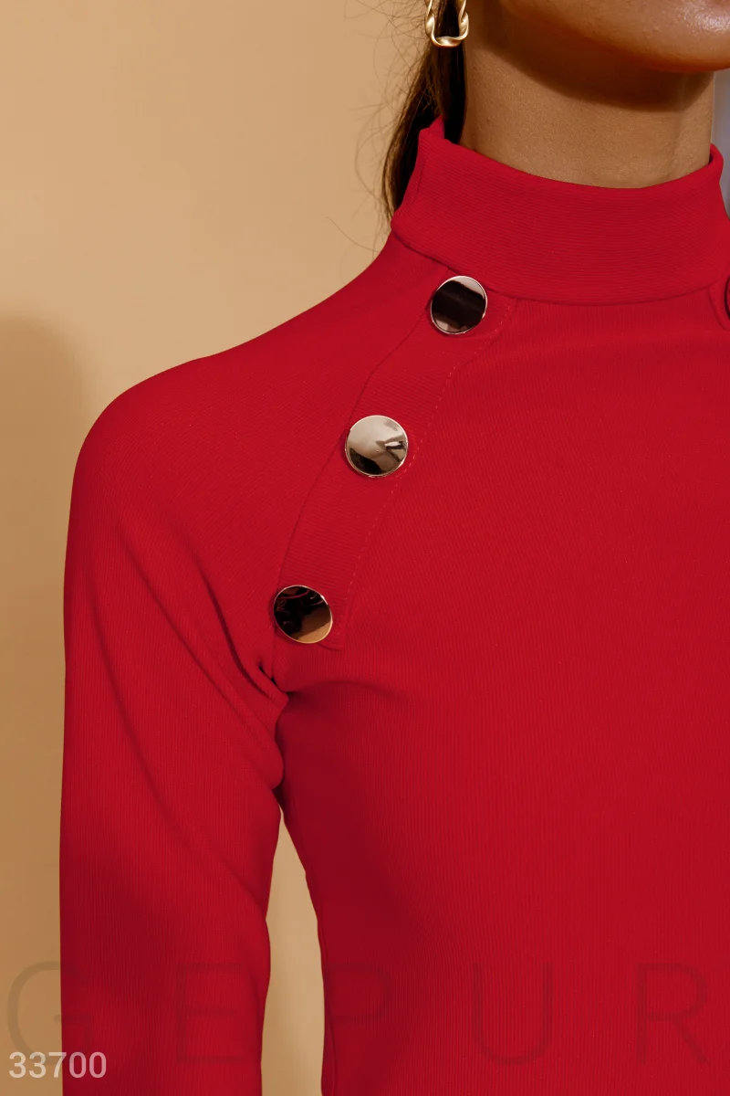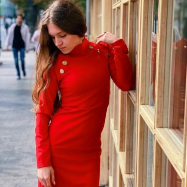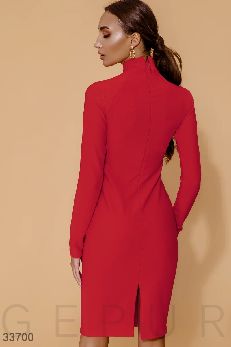 Облегающее платье-футляр с воротником-стойкой, длинным рукавом, спереди дополненное яркими декоративными пуговицами, невысокий разрез сзади.