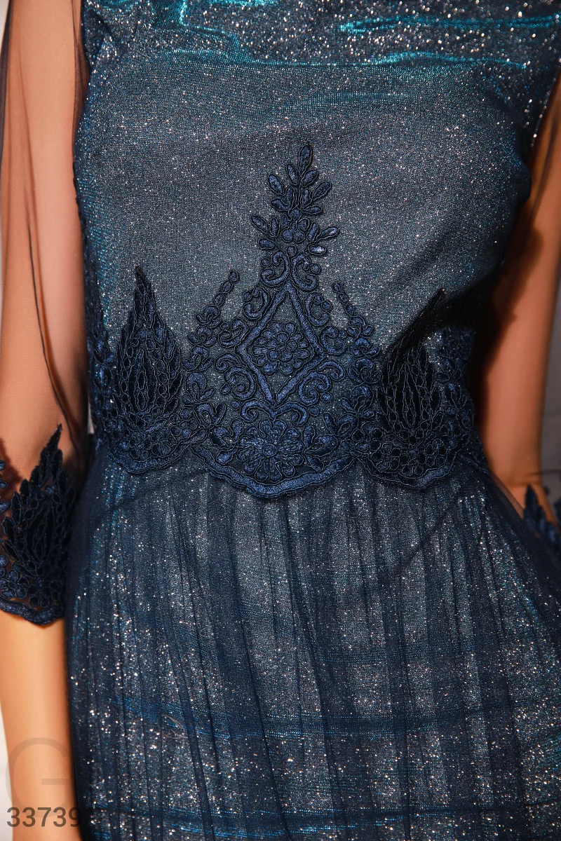 Изящное вечернее платье нежно-синего цвета с мерцающими частицами: круглый вырез, прозрачный рукав ¾ с кружевной манжетой, отрезная талия и подол расклешенной юбкой дополнены ажурным декором. Основа создана из эластичной ткани с люрексовой нитью.