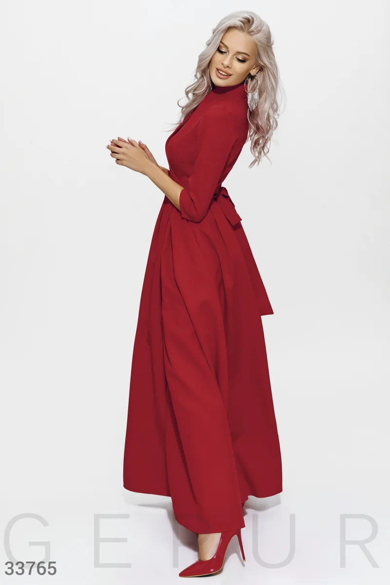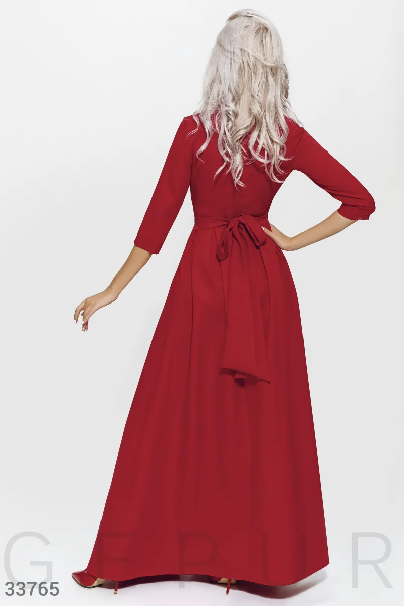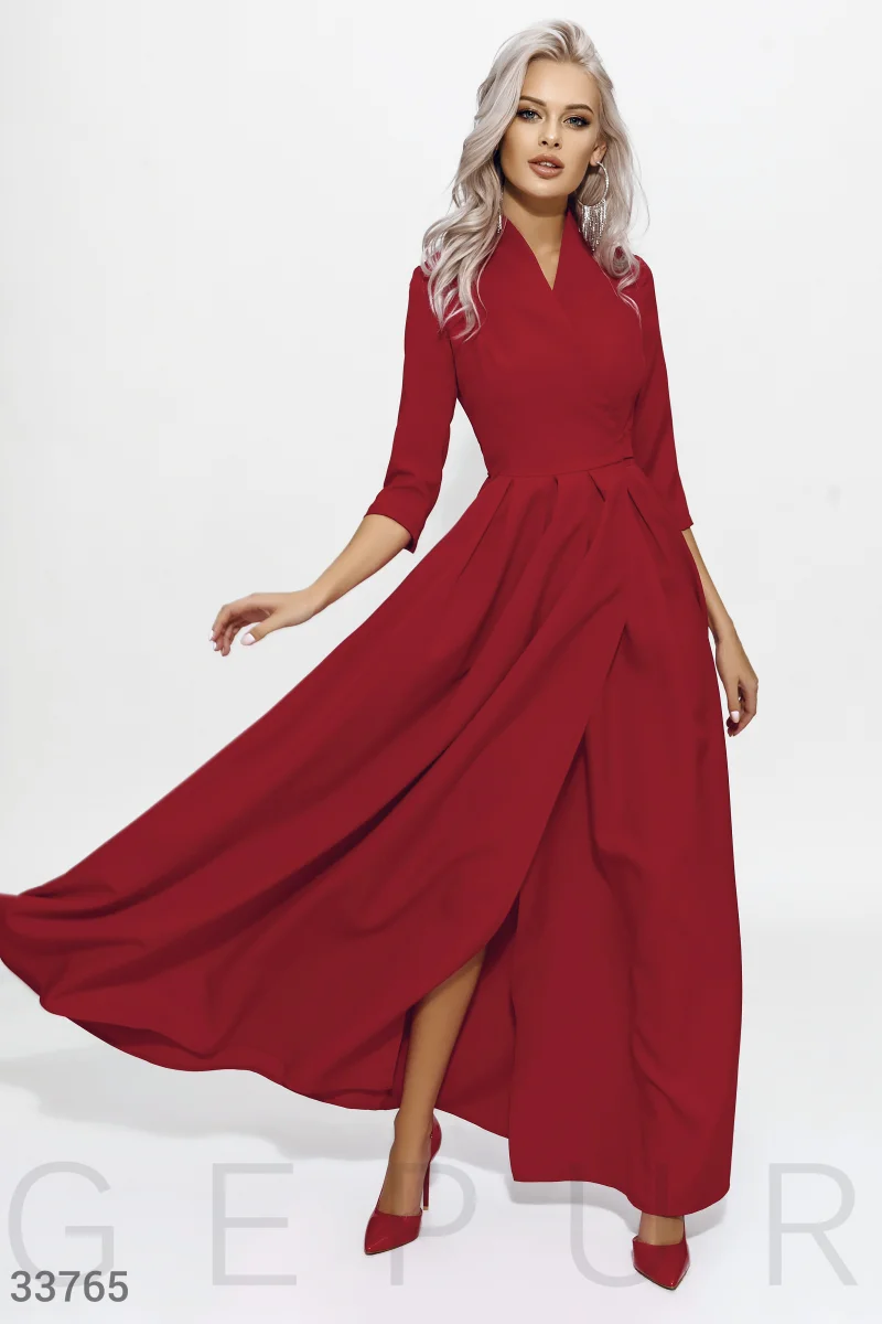 Длинное вечернее платье на запа́х красного цвета: изящный шалевый воротник, рукав ¾, отрезная талия, два кармана в швах, и роскошная юбка в легкую складку с высоким боковым разрезом.
