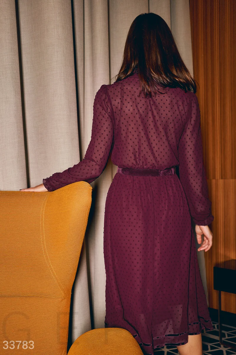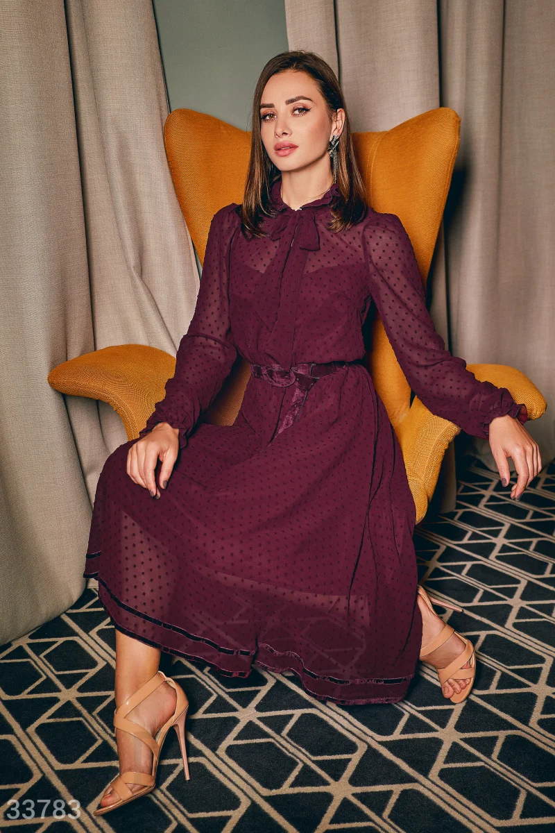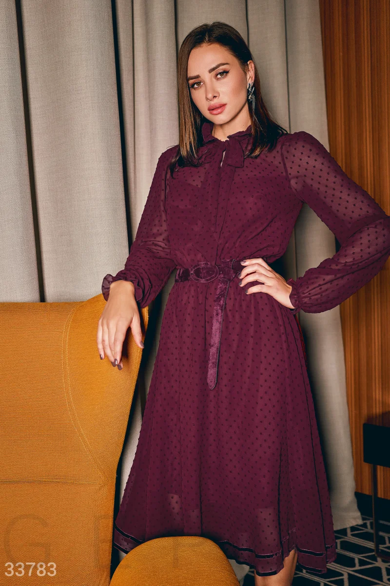 Вечернее платье-макси из воздушного шифона с флоковым напылением, дополненное ремнем из эко-кожи: воротник-аскот с завязками и рюшами, длинный объемный рукав на эластичной манжете, отрезная талия с эластичной вставкой, расклешенная юбка в легкую складку на подкладе, подол декорирован велюровой тесьмой.