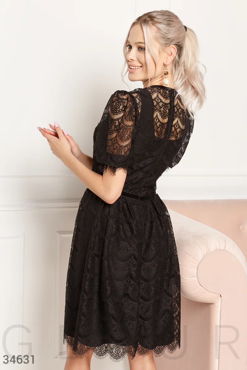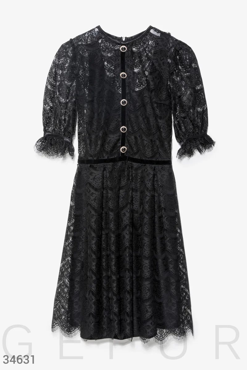 Кружевное платье сдержанного кроя. Платье-основа в бельевом стиле. Объемный короткий рукав, круглый вырез, планка с пуговицами спереди, отрезная талия с бархатной пришивной лентой, фигурный подол.