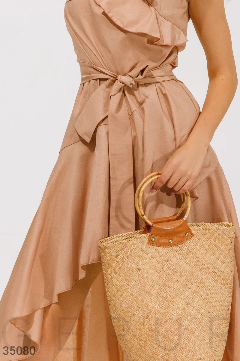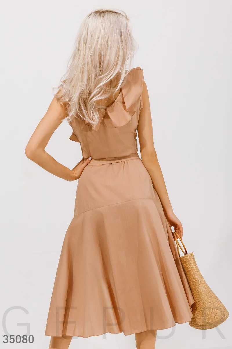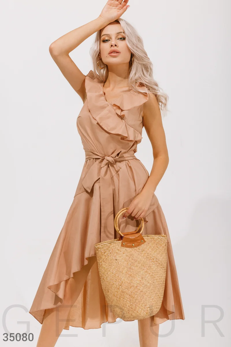 Платье-миди ассиметричного кроя бежевого оттенка. V-образный глубокий вырез, дополненный воланами. Удлиненная спинка, объемные воланы на подоле расклешенной юбки. В комплекте тканевый съемный пояс.