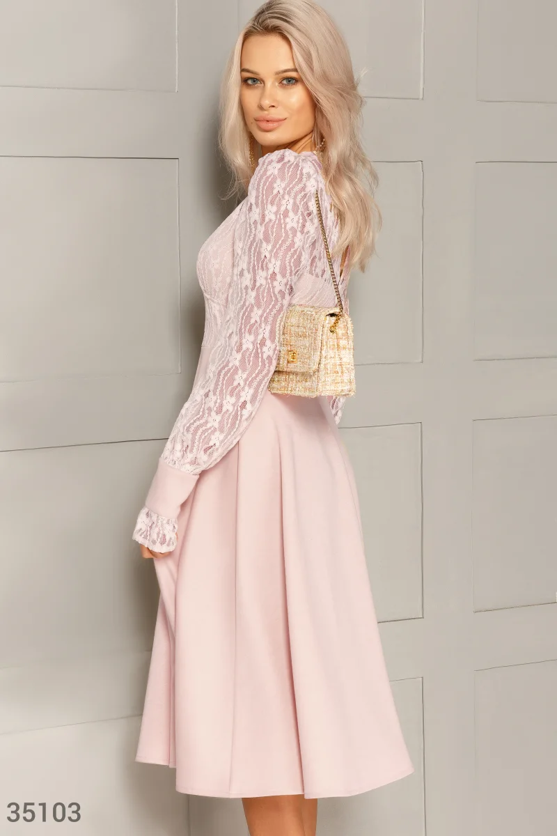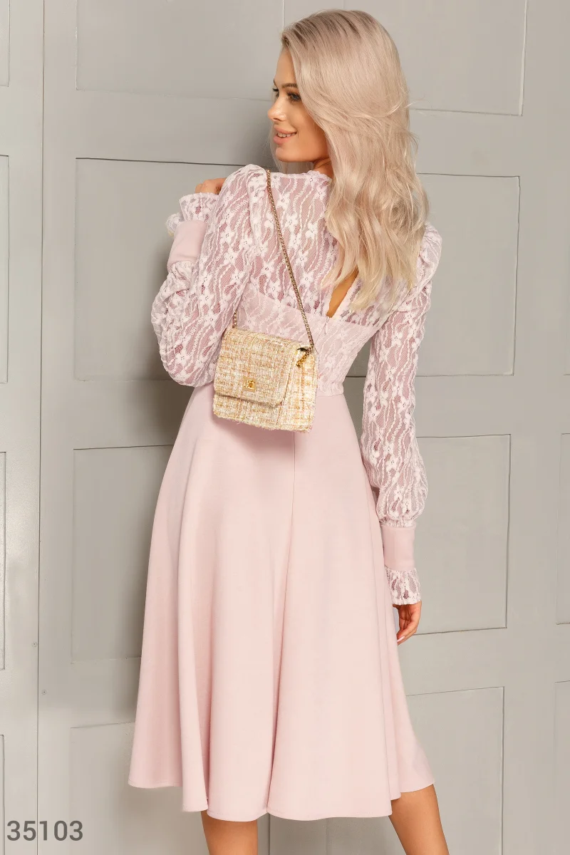 Пудровое расклешенное платье-миди с полупрозрачными объемными рукавами и ажурным верхом комбинирует изысканное кружево premium-класса и мягкую и эластичную ткань с мелкоузорчатым переплетением (креп-дайвинг). Элегантную модель дизайнеры Gepur включили в зимнюю коллекцию 2020 года. Это изделие безупречно подчеркнет женственность и сексуальность его обладательницы.