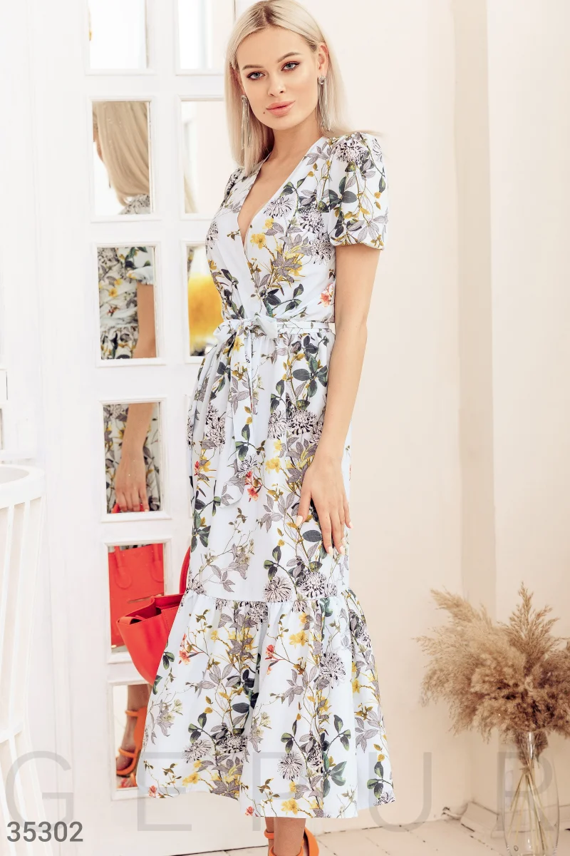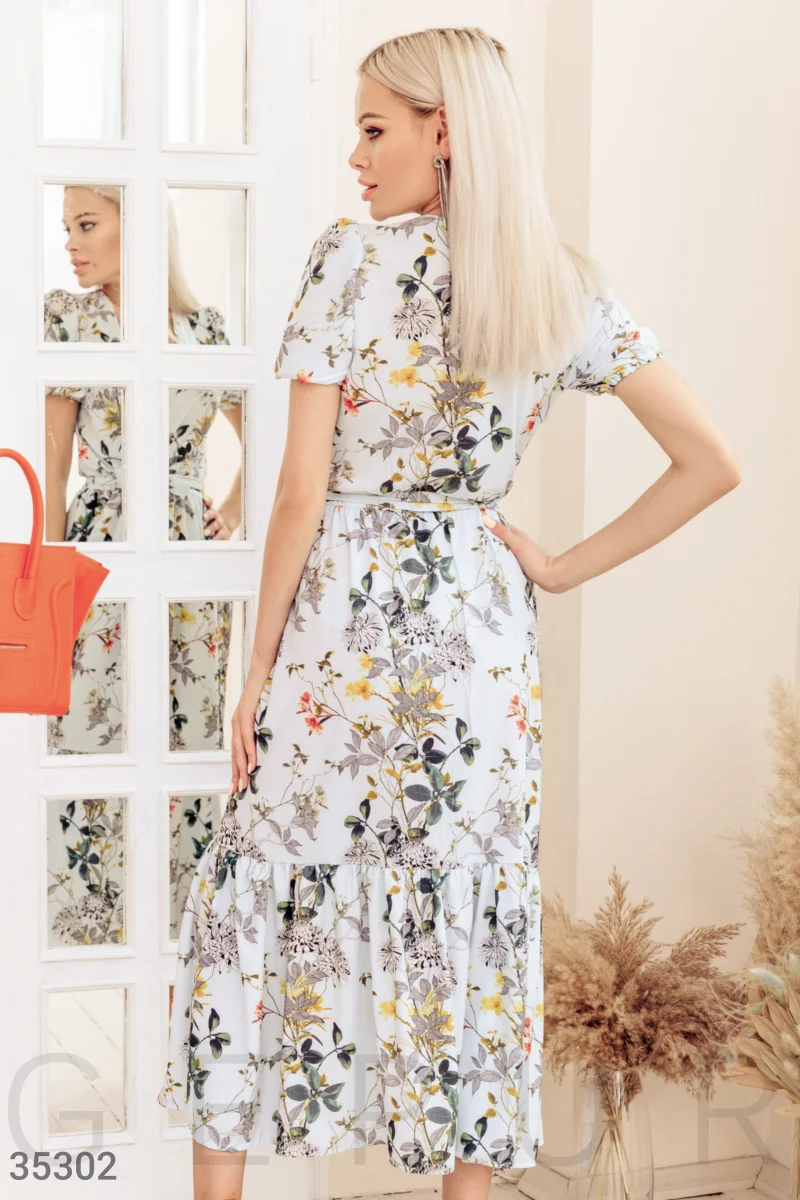 Платье нежно-голубого цвета с ярким цветочным принтом. Глубокое v-образное декольте, короткий объемный рукав. Эластичная вставка на талии и расклешенная юбка с воланом на подоле. В комплекте тканевый съемный пояс.