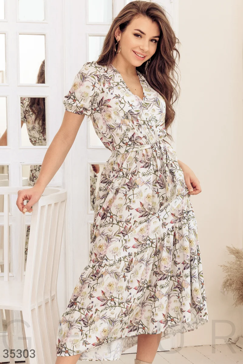 Платье молочного оттенка с ярким цветочным принтом. Глубокое v-образное декольте, короткий объемный рукав. Эластичная вставка на талии и расклешенная юбка с воланом на подоле. В комплекте тканевый съемный пояс.