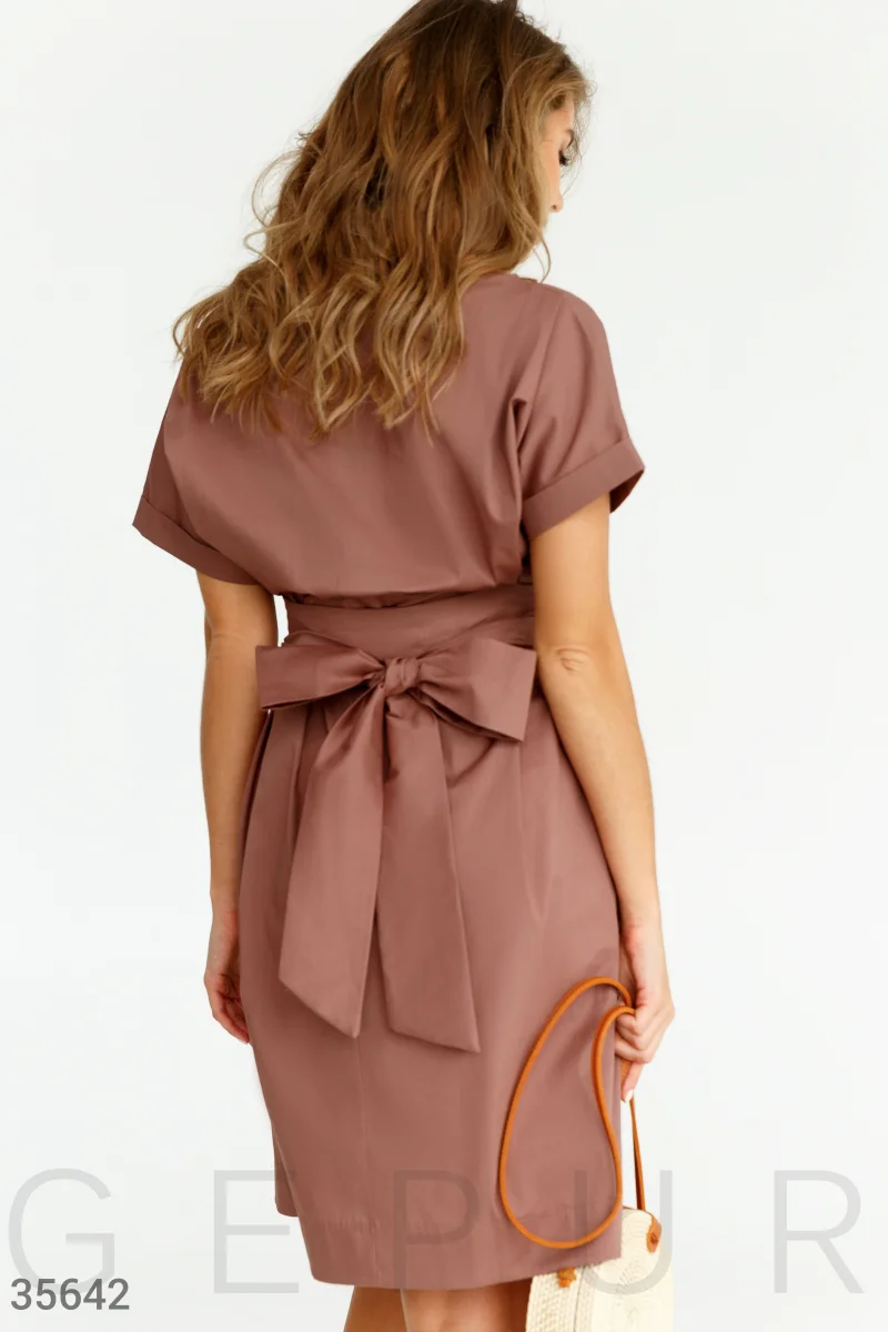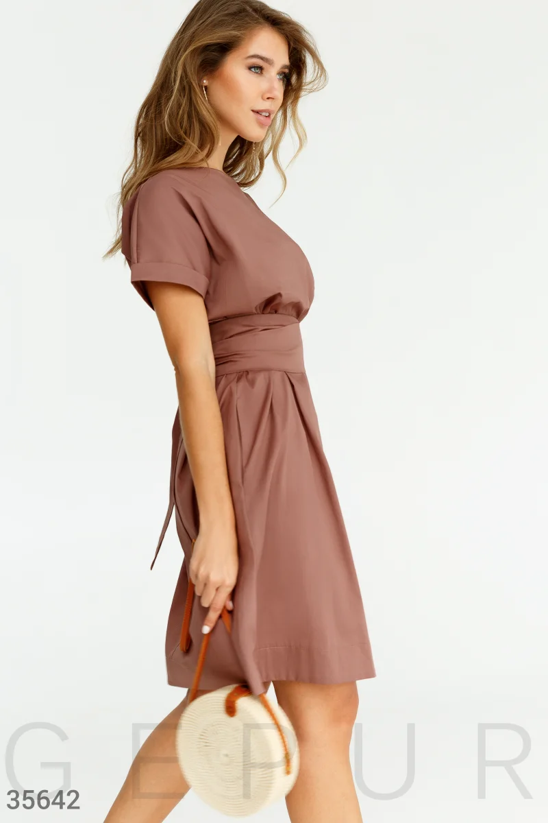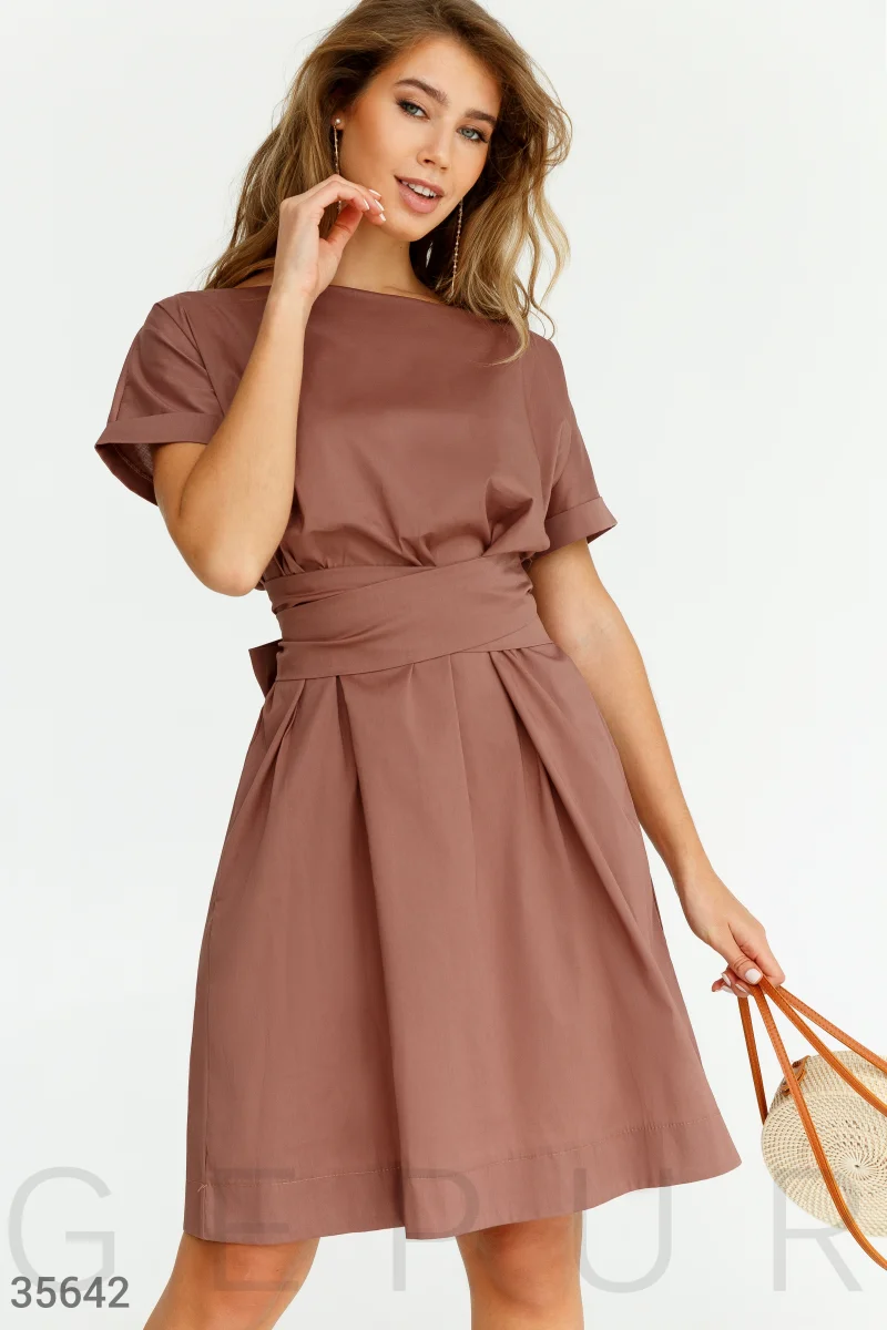 Платье универсального размера оттенка какао. Круглый воротник, фиксированные отвороты на коротких рукавах. Акцент на талии регулируется с помощью широкого пояса.