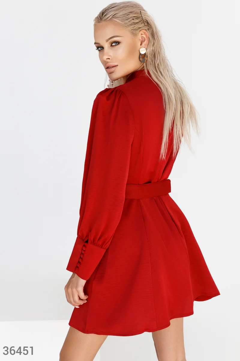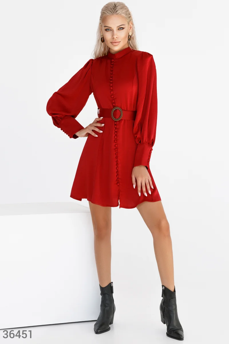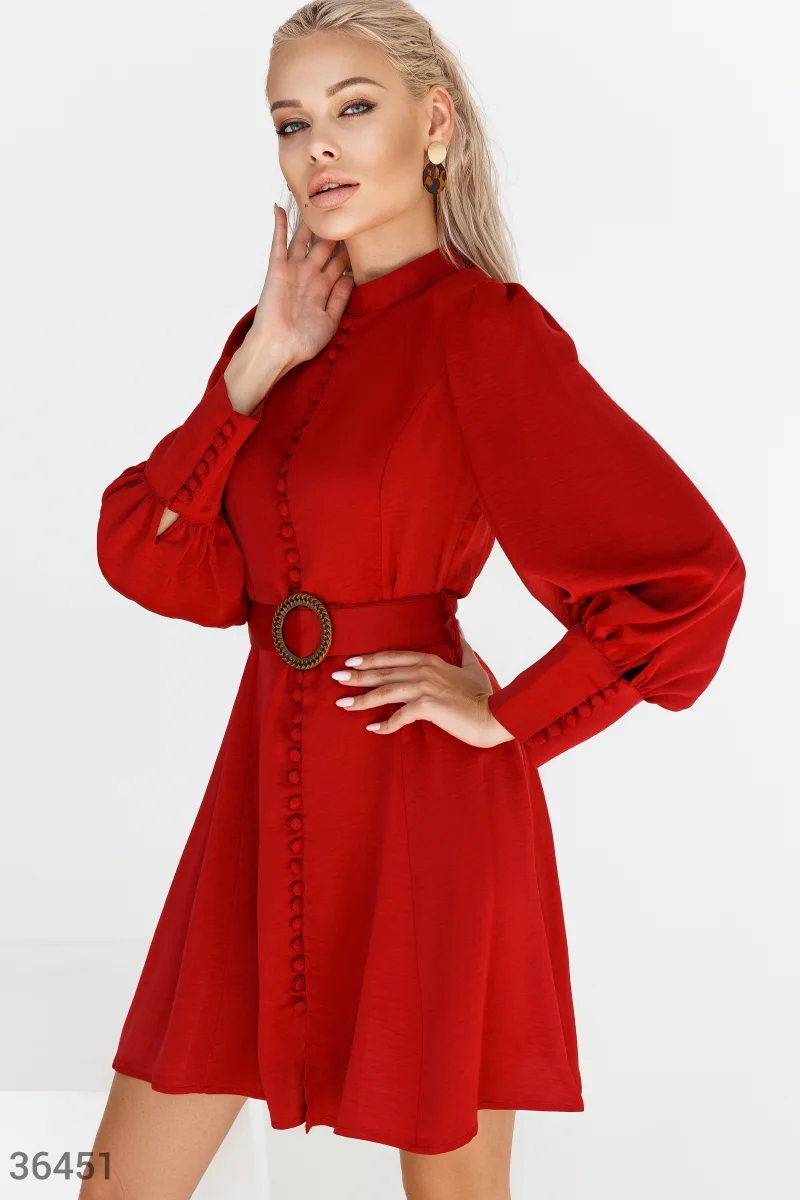 Женственное платье-мини выполнено из легкого материала с легким блеском. Декоративная планка с пуговицами с фронтальной стороны, пышные рукава на манжетах, воротник-стойка придают модели викторианскую стилистику. Линию талии подчеркивает съемный пояс с массивной пряжкой.