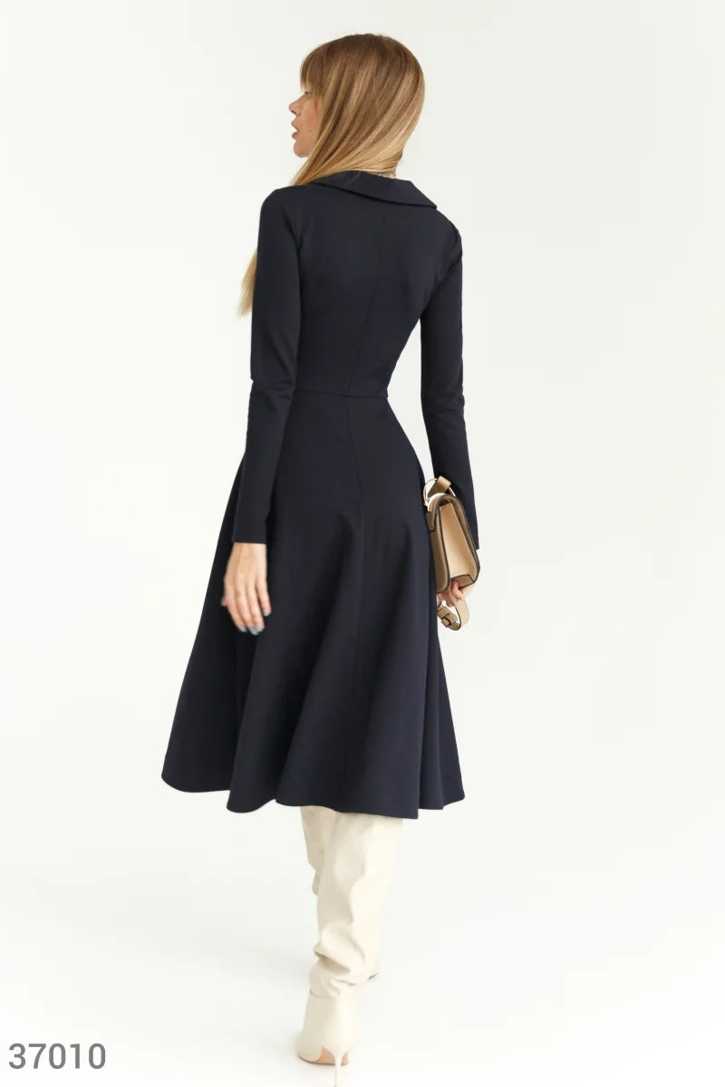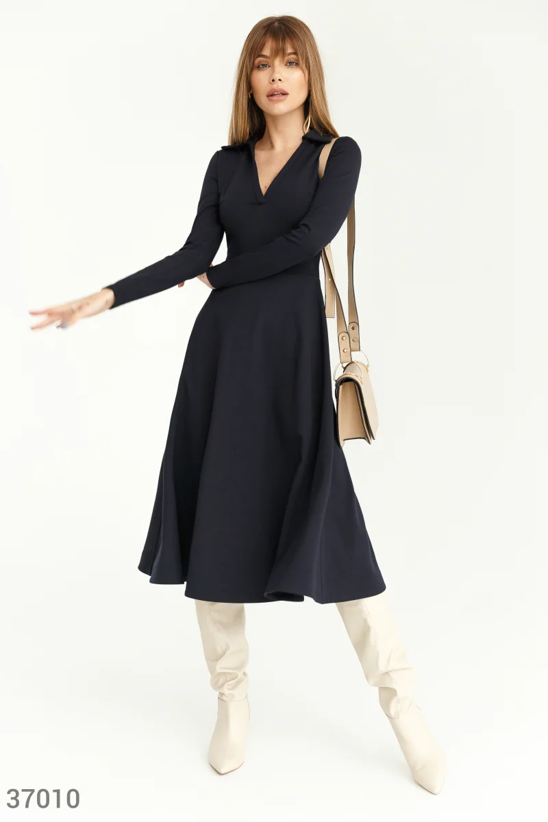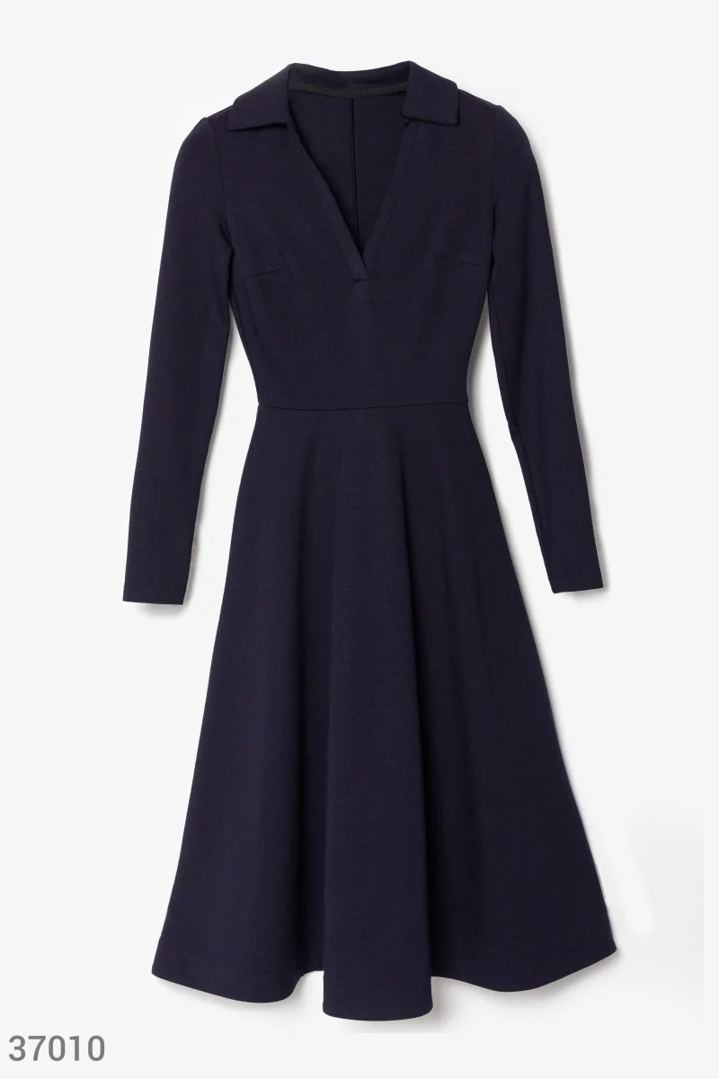 Темно-синие платье с длинными рукавами и расклешенным подолом выглядит романтично благодаря приталенному крою. Отложной воротник с v-образным вырезом поддерживает настроение.