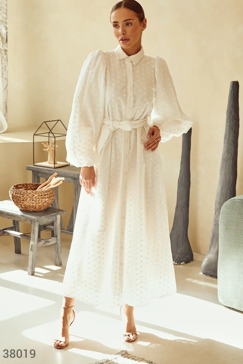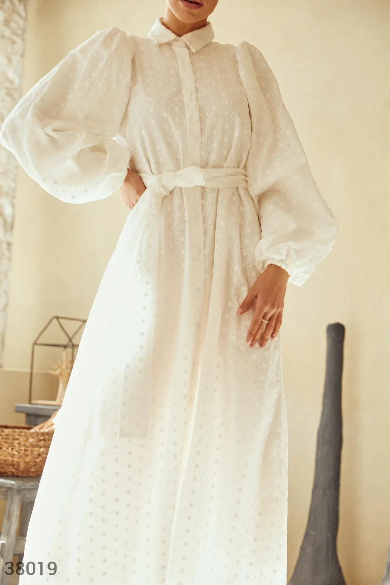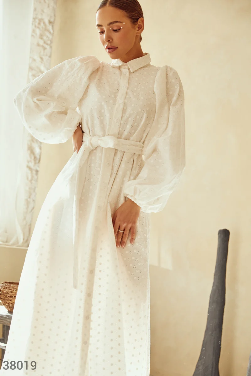 В создании романтичного образа для теплой погоды длинному платью нет равных. Правильное настроение задали при помощи материала с минималистичной вышивкой и объемных рукавов в духе показов FW’20/21 Fendi и Balenciaga. Рубашечный крой с отложным воротником дополнили поясом, позволяющим подчеркнуть талию.