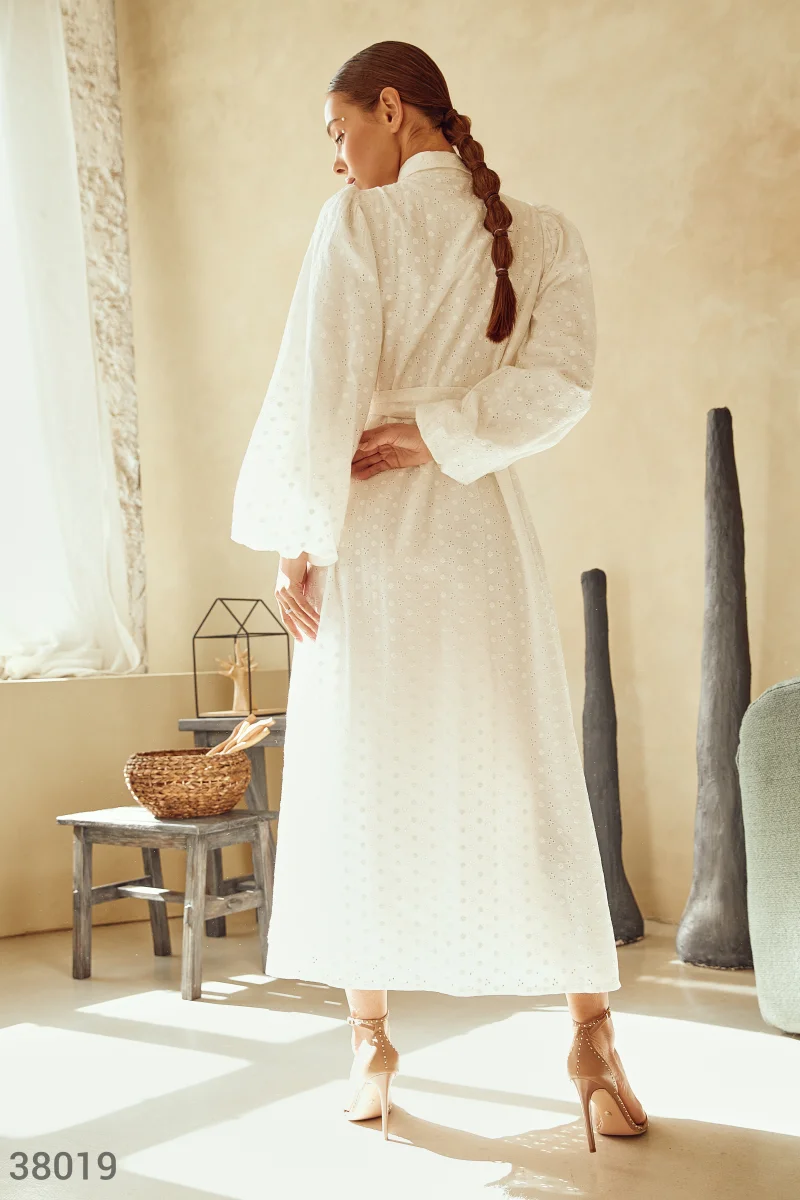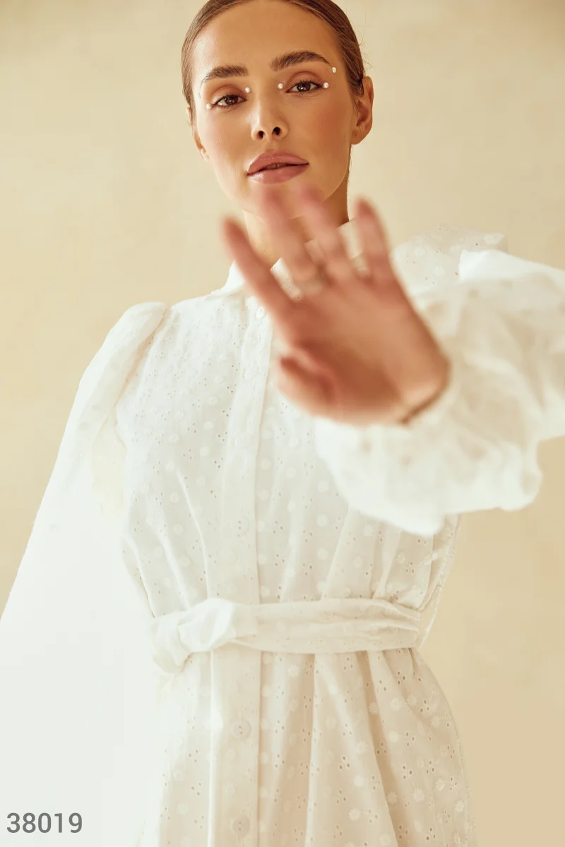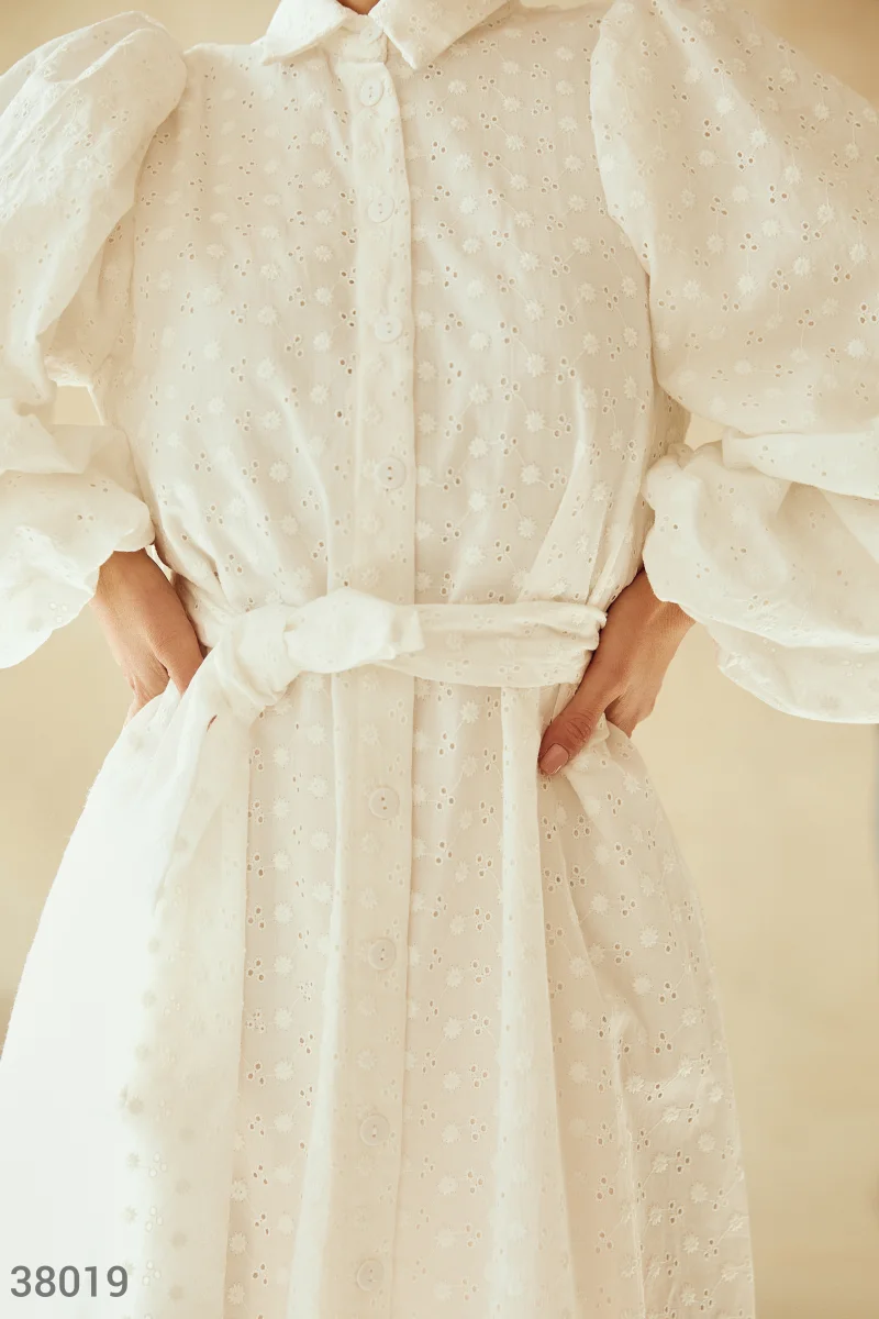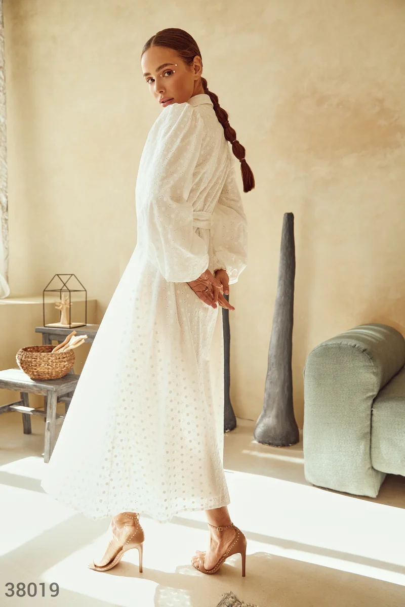 В создании романтичного образа для теплой погоды длинному платью нет равных. Правильное настроение задали при помощи материала с минималистичной вышивкой и объемных рукавов в духе показов FW’20/21 Fendi и Balenciaga. Рубашечный крой с отложным воротником дополнили поясом, позволяющим подчеркнуть талию.