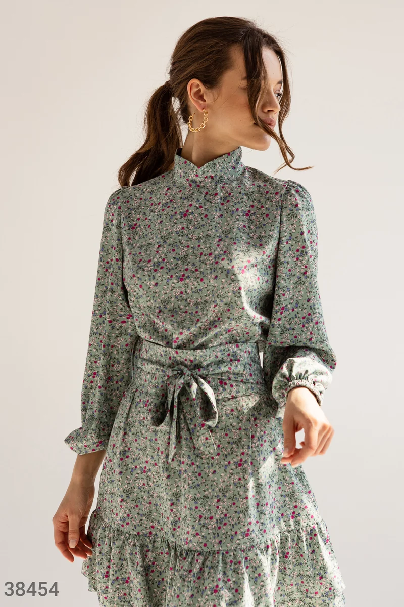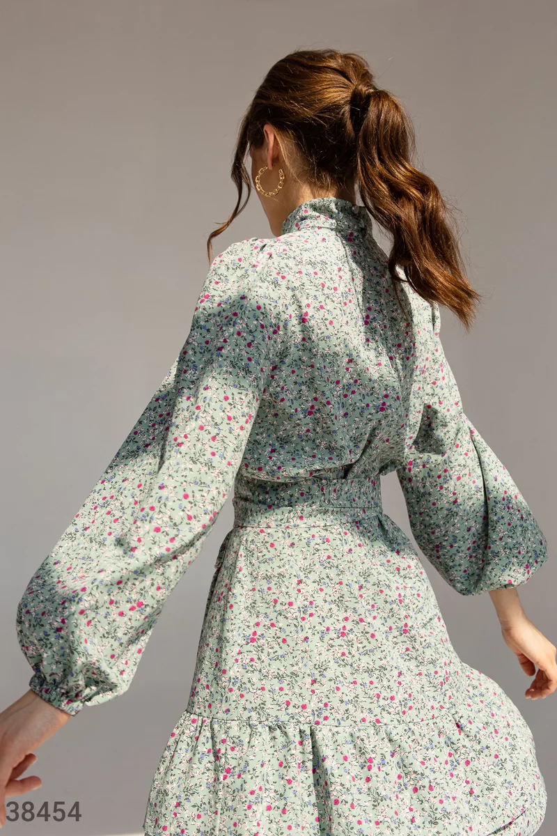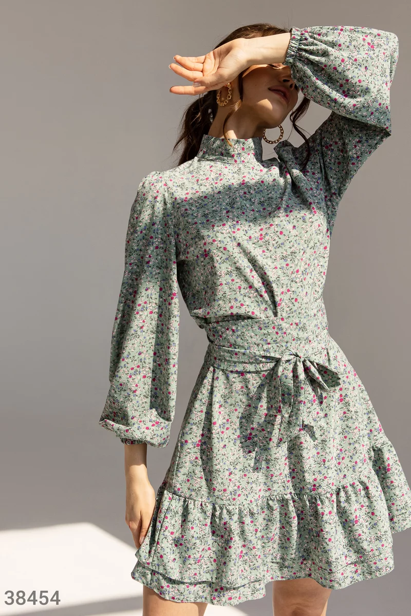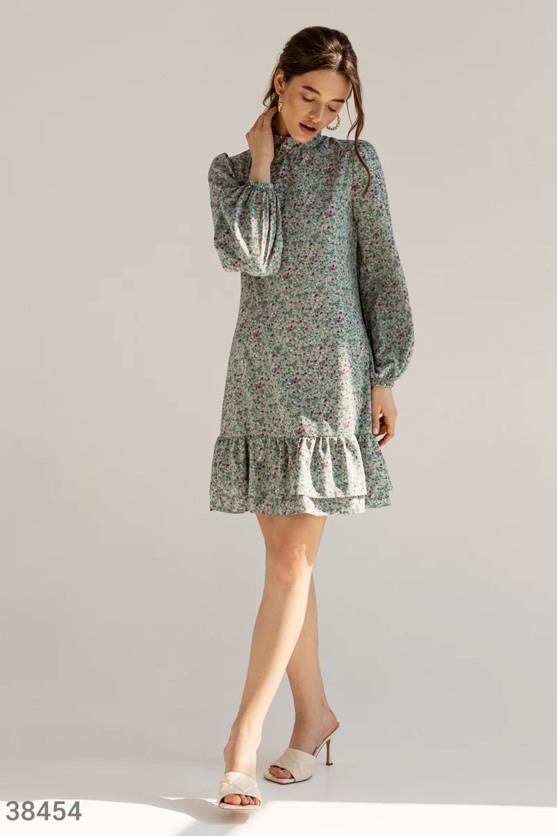 Платье-мини в приглушенном зеленом оттенке выполнено из легкой ткани, которая, как нельзя, лучше подходит для теплой погоды. Модель дополнена двухслойным воланом на подоле, воротником-стойкой и объемными рукавами в духе показов SS’21 Balmain и Balenciaga. Сделать силуэт приталенным позволяет пояс.