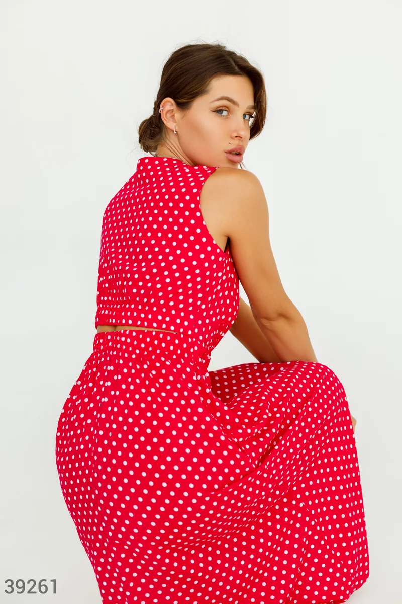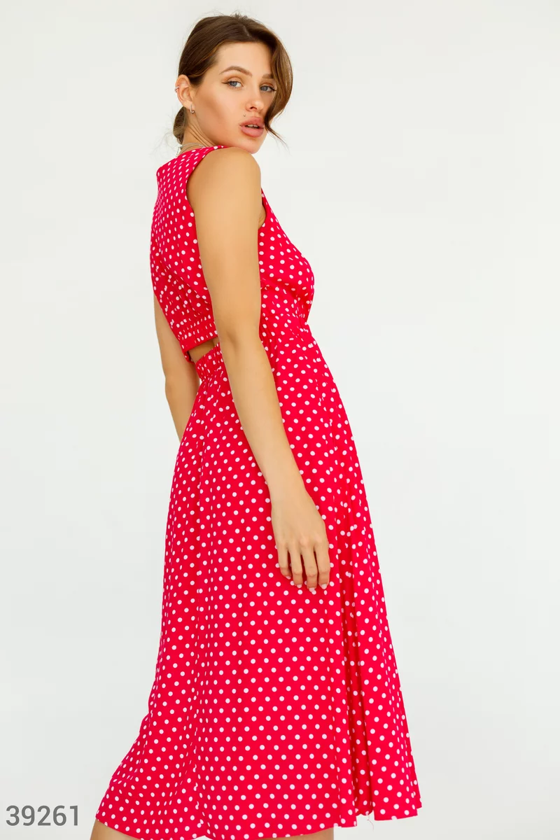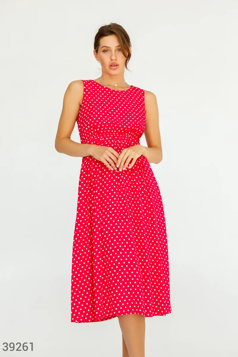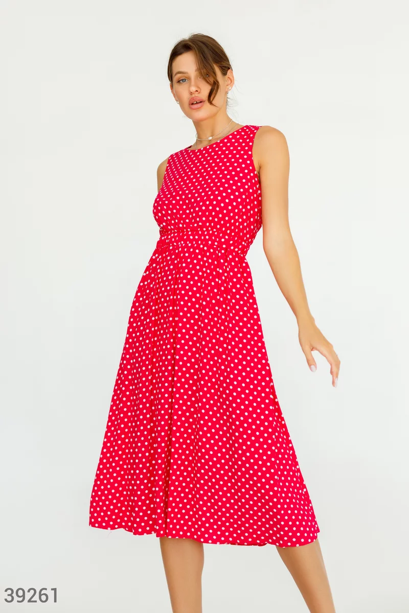 Яркое платье из хлопковой ткани в горошек. Классический крой А-силуэта, аккуратный круглый вырез и длинная расклешенная юбка длины миди. Главной особенностью модели является вырез на поясе, дополненный эластичными вставками. Такое решение не только придает платью свою изюминку, но и компенсирует отсутствие застежки.