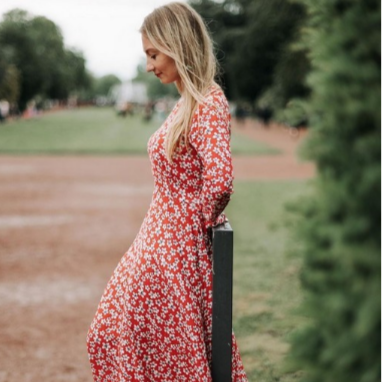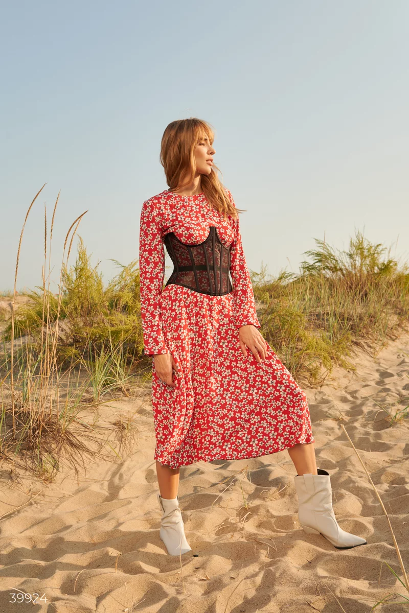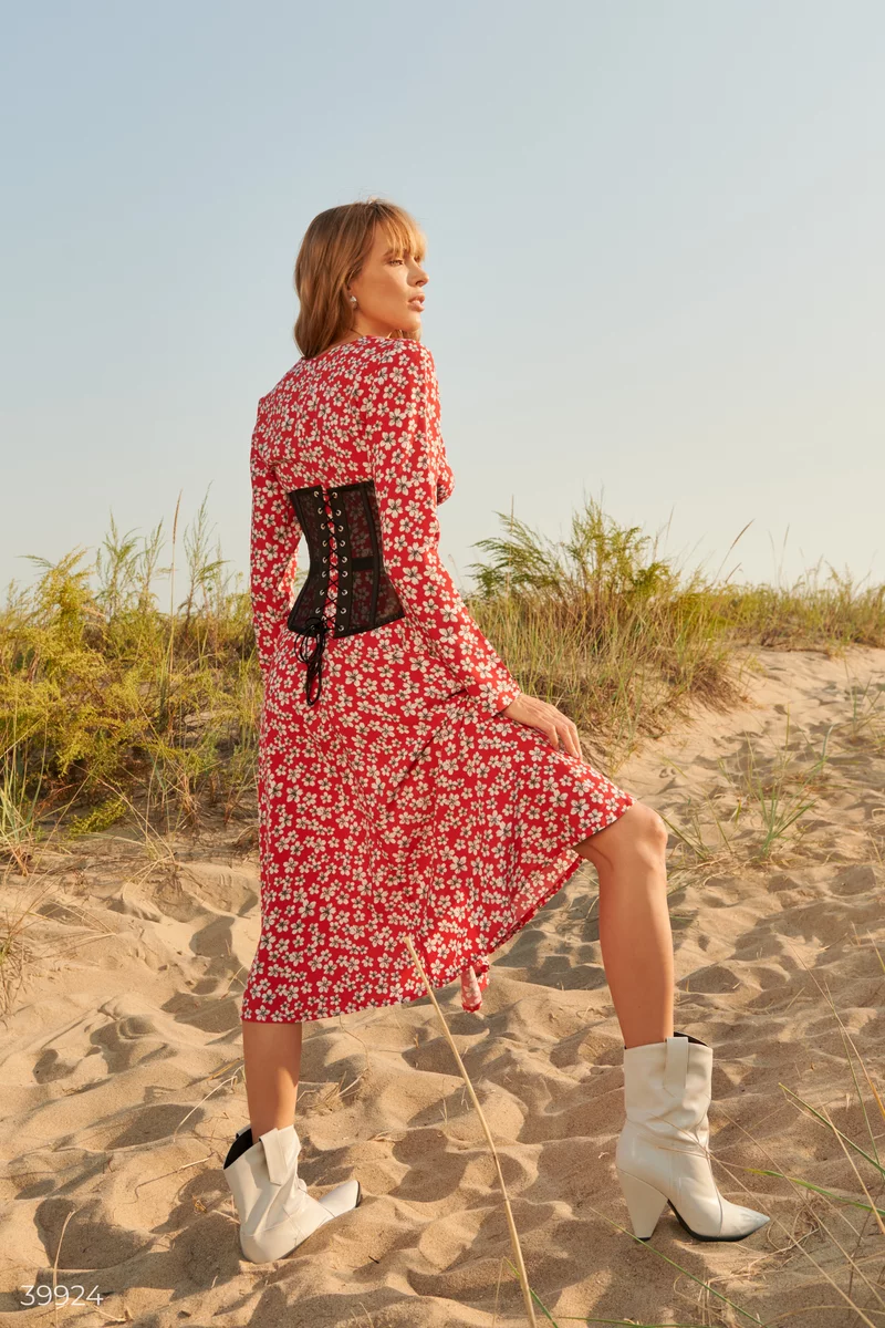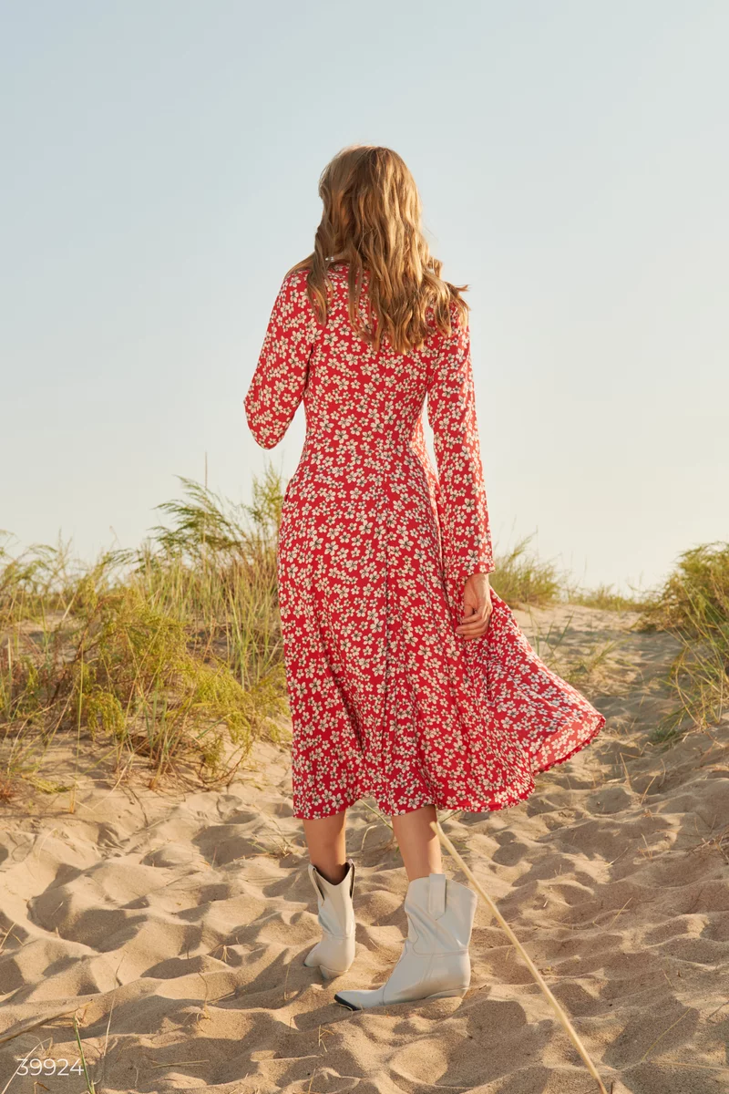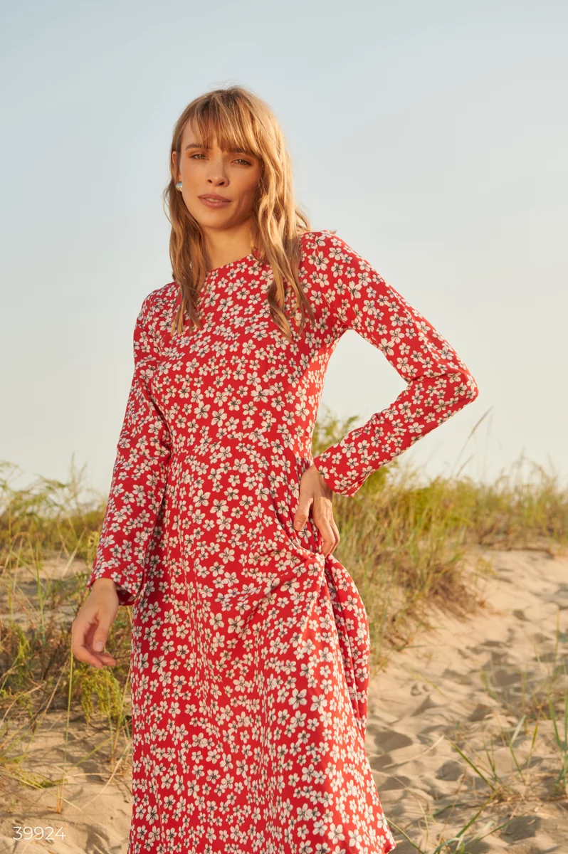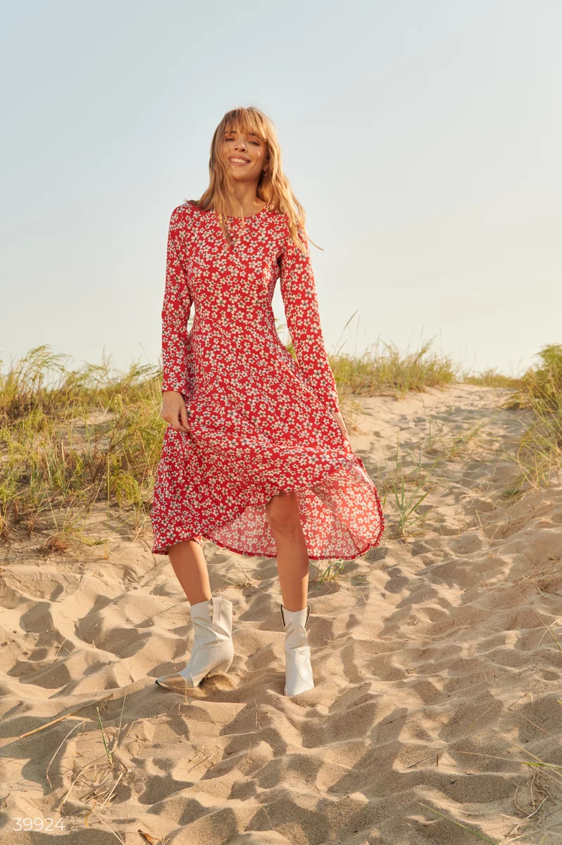 Нежное цветочное платье красного цвета красиво садиться по фигуре за счет приталенного кроя. Длинные рукава, сзади присутствует молния, юбка расклешенного кроя, которая позволит чувствовать себя максимально свободно.