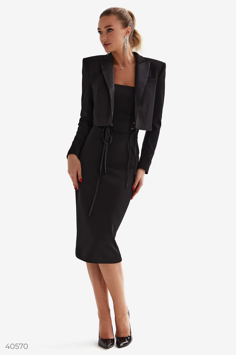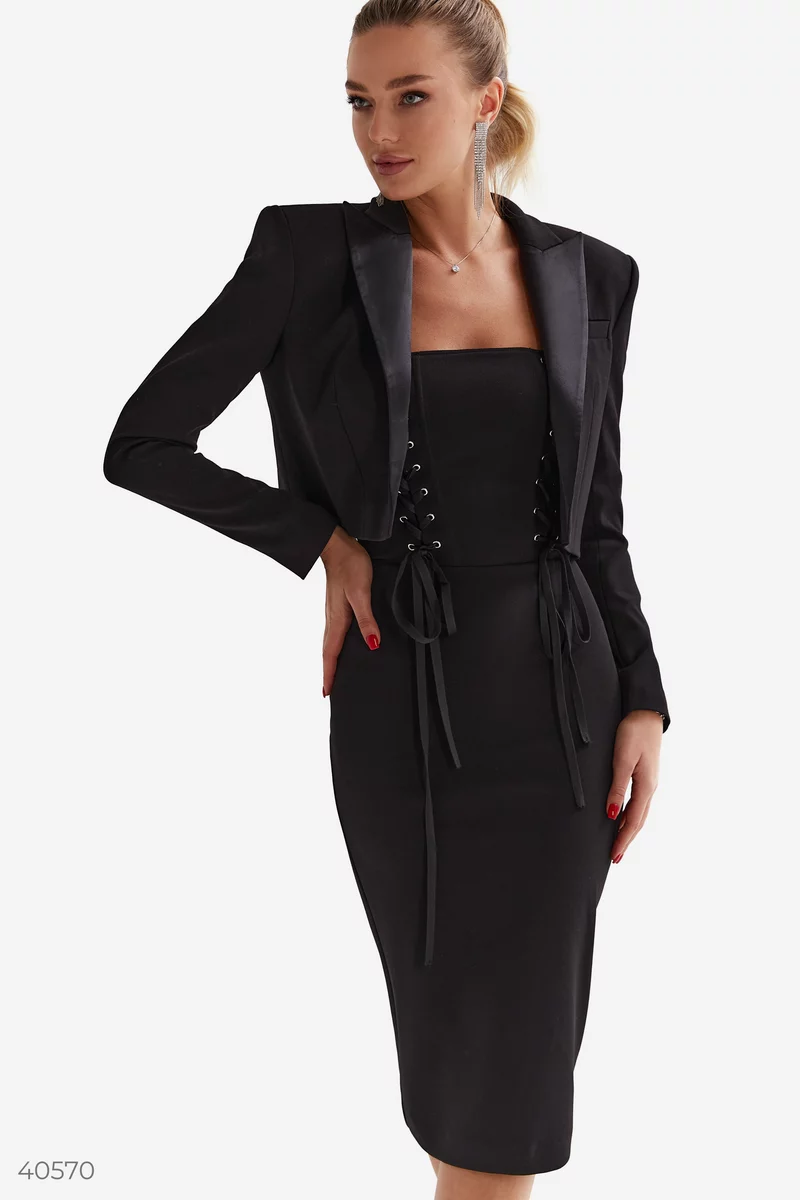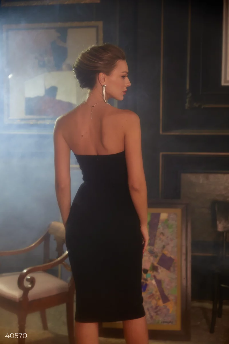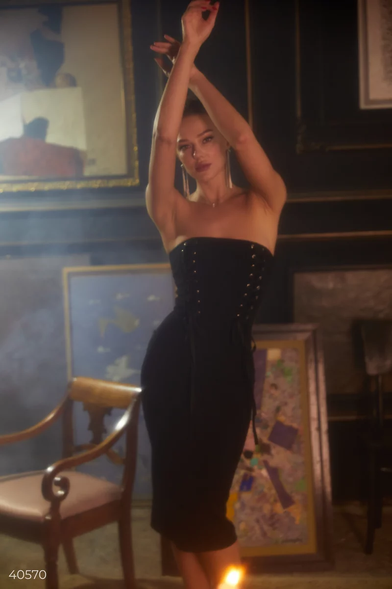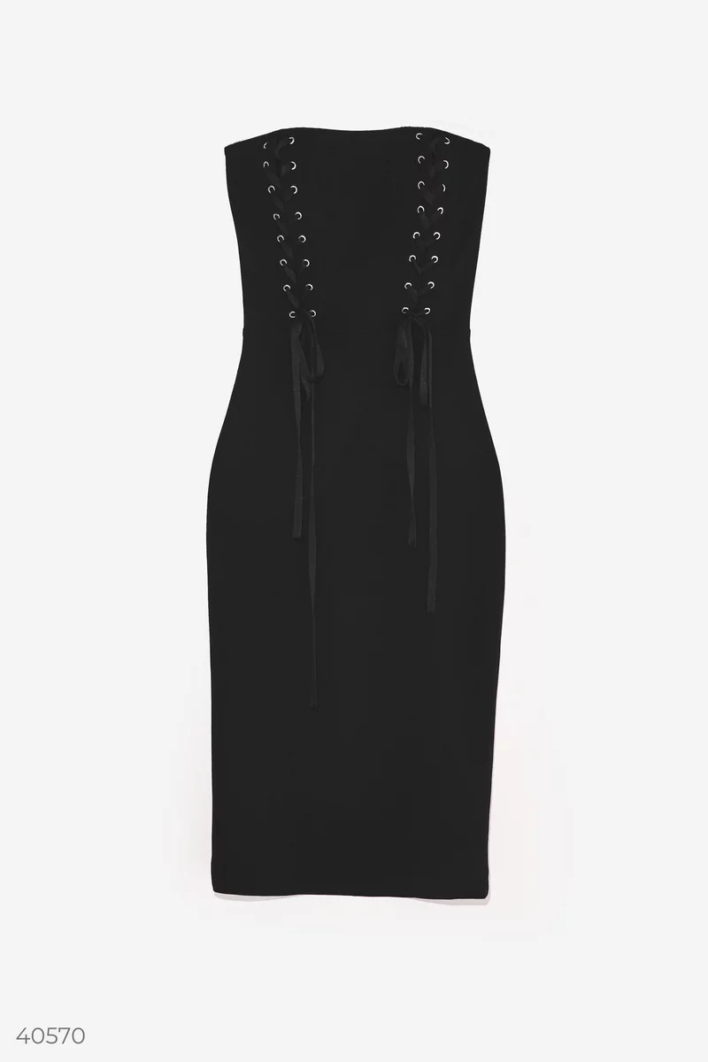 Черное платье без бретелей на косточках. Дизайнеры Gepur стилизовали модель шнуровкой, что добавляет модели контраста на фоне классической длины миди. Сочетайте платье с классическими лодочками, а в качестве аксессуара выбирайте актуальную цепочку, которая поможет сделать акцент на шею.
