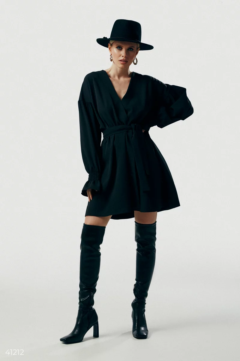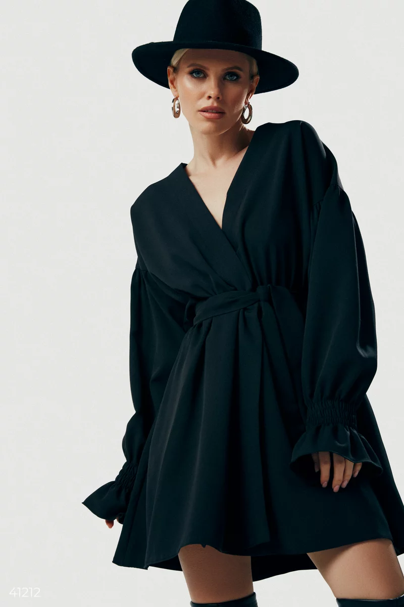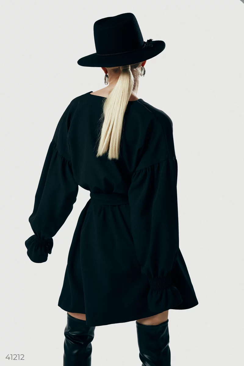 Черное платье мини выполнено из костюмной ткани. Модель с эластичной вставкой в поясе, с манжетами декорированными оборками. В комплект входит пояс в тон, который поможет подчеркнуть талию. Сочетайте платье с высокими сапогами и акцентными серьгами в качестве аксессуара.