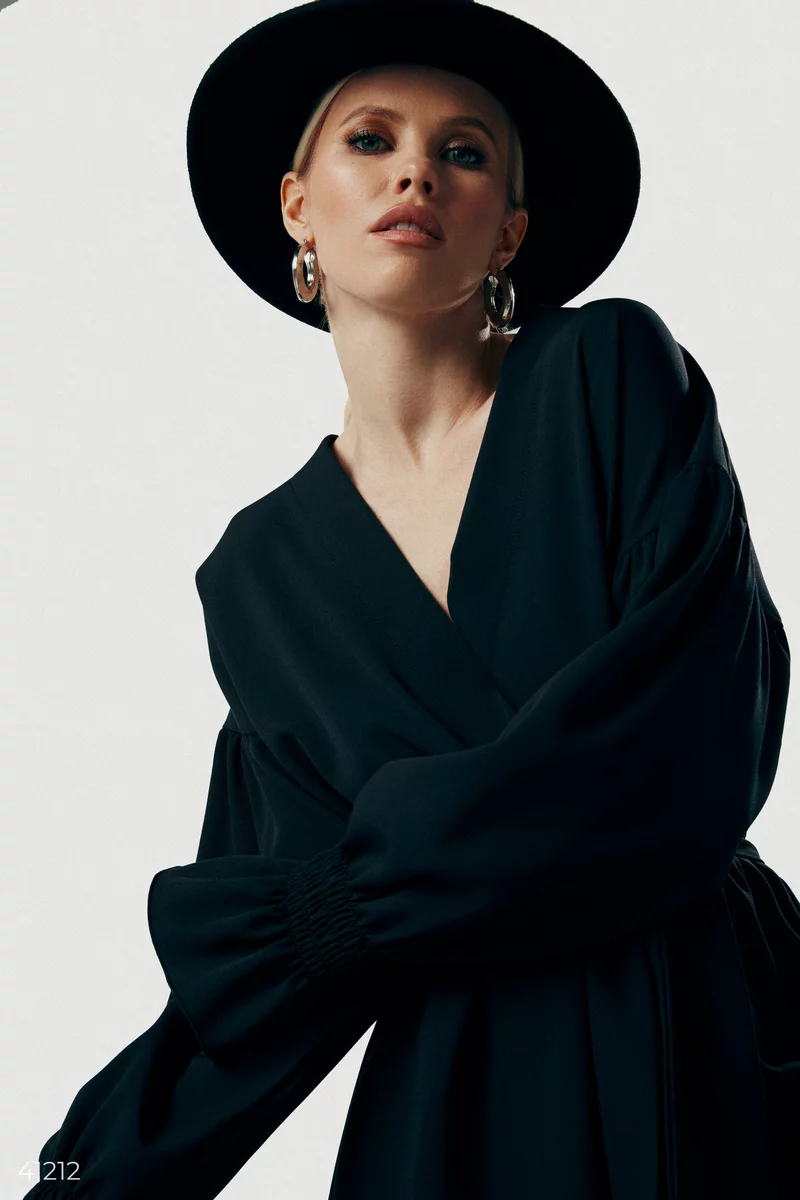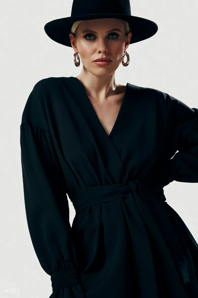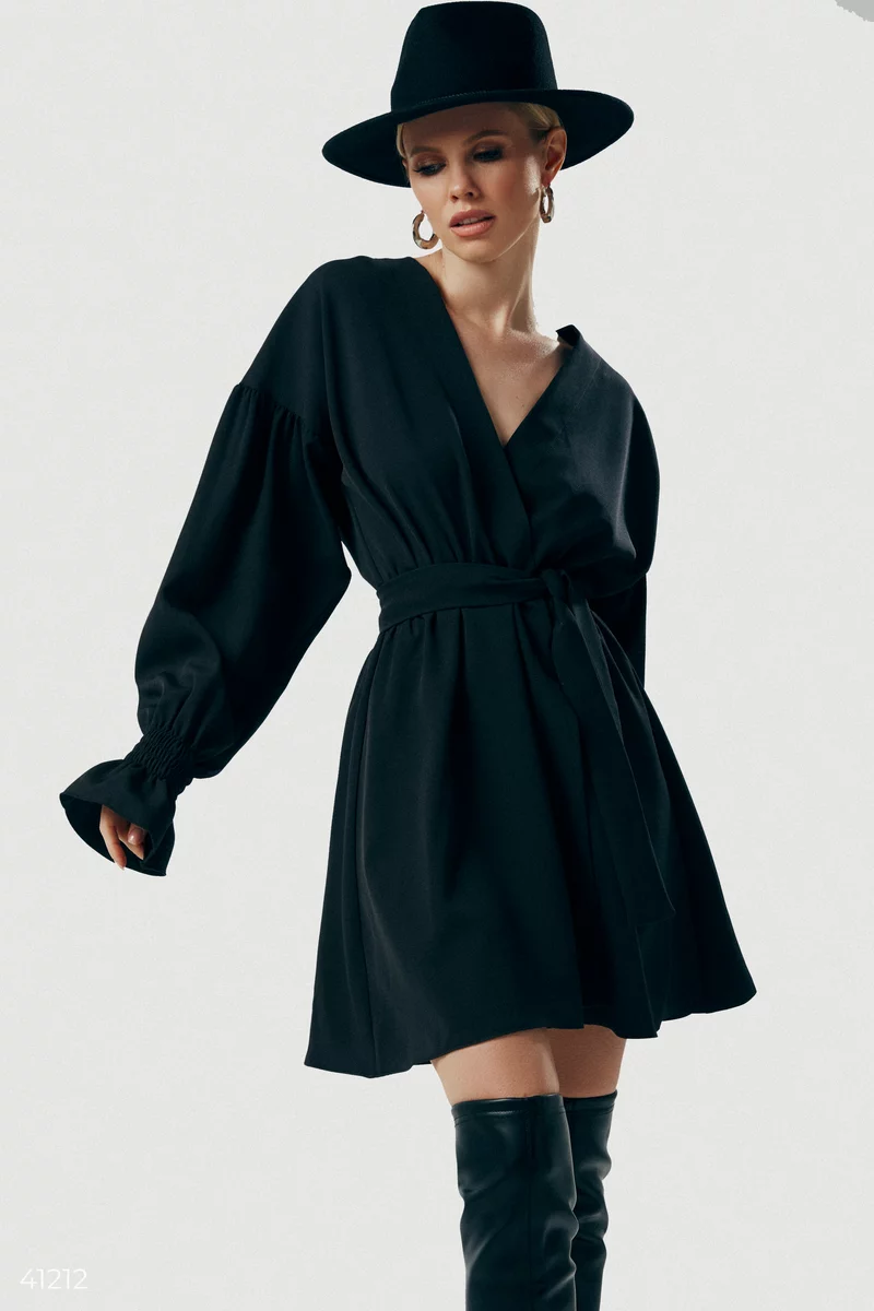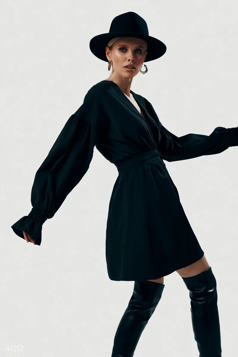 Черное платье мини выполнено из костюмной ткани. Модель с эластичной вставкой в поясе, с манжетами декорированными оборками. В комплект входит пояс в тон, который поможет подчеркнуть талию. Сочетайте платье с высокими сапогами и акцентными серьгами в качестве аксессуара.