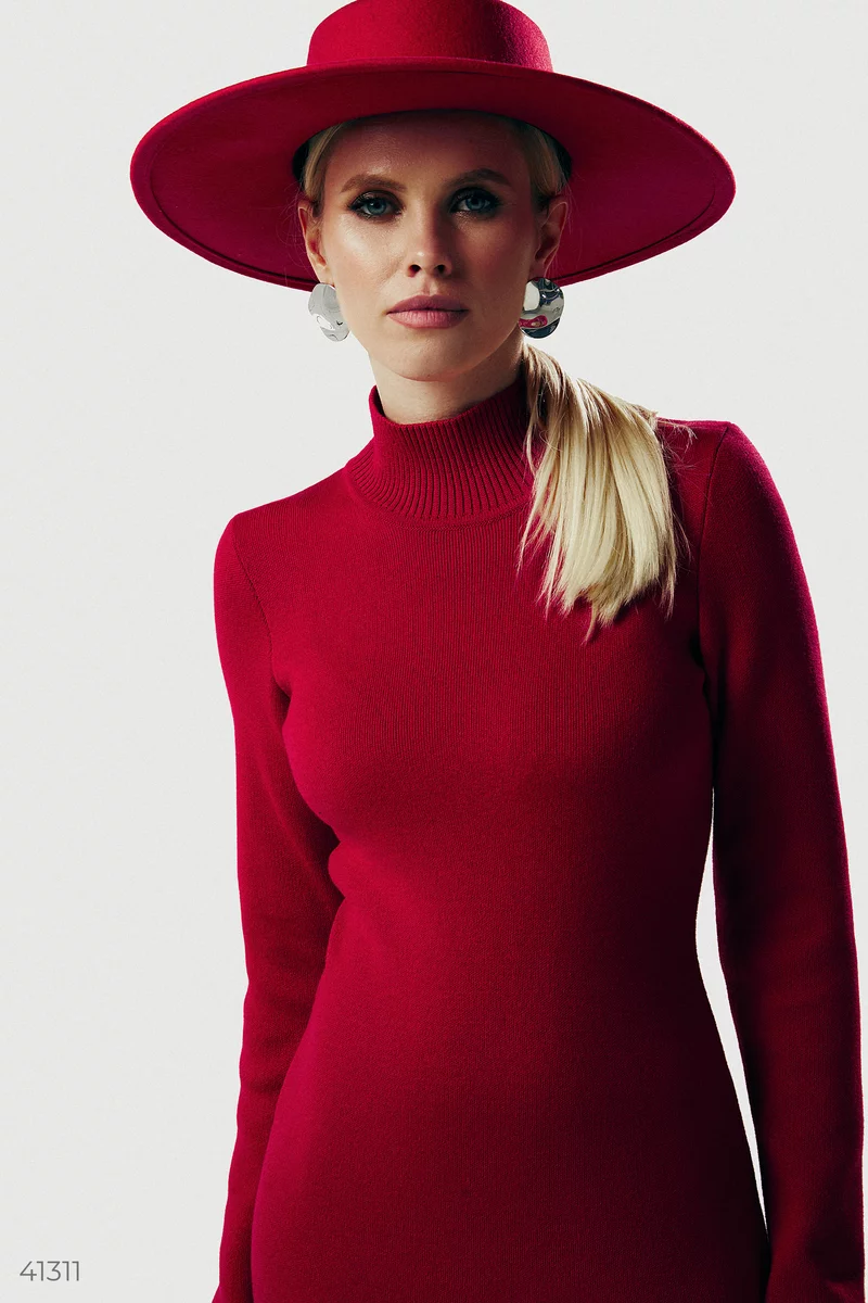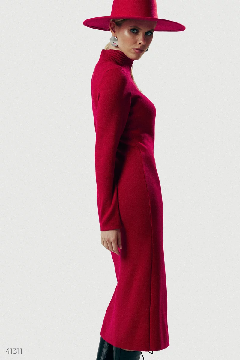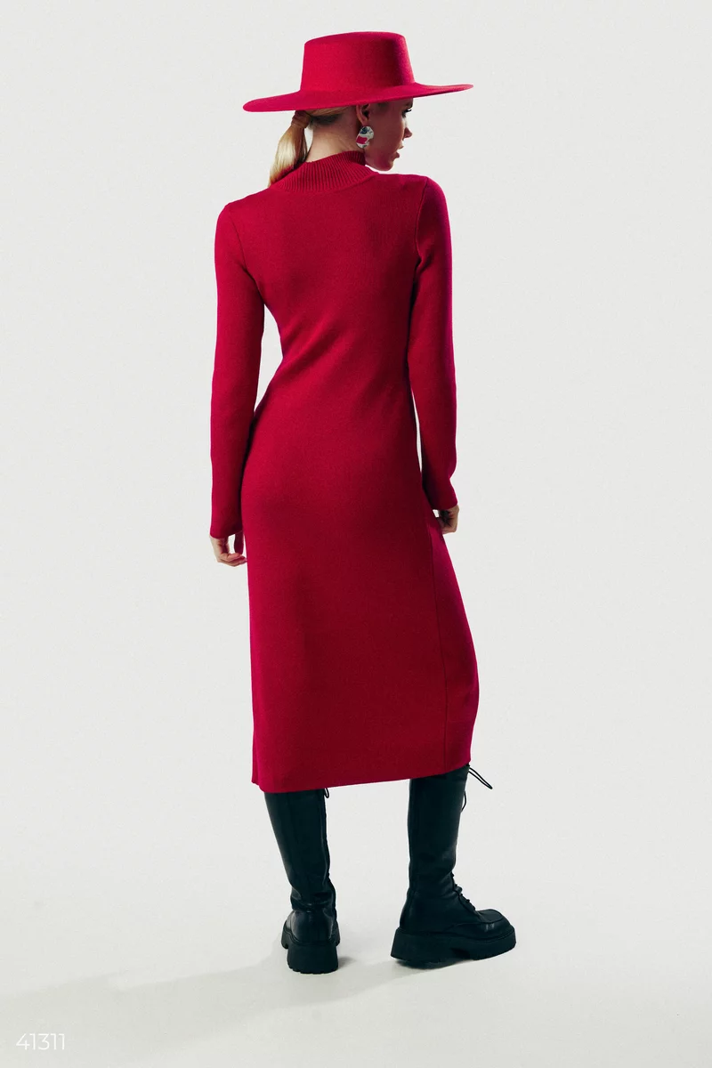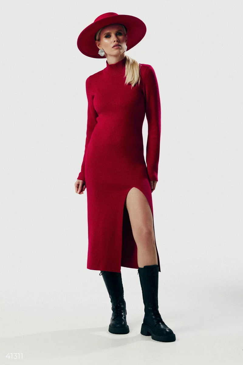 Красное платье миди выполнено из плотного трикотажного материла, что позволит оставаться в тепле и чувствовать себя женственно в холодный период года. Модель с воротником стойкой и длинными рукавами дополнена разрезом сбоку, который подчеркнет линию ног. Сочетайте платье с высокими сапогами и пальто oversize для создания стильного образа.