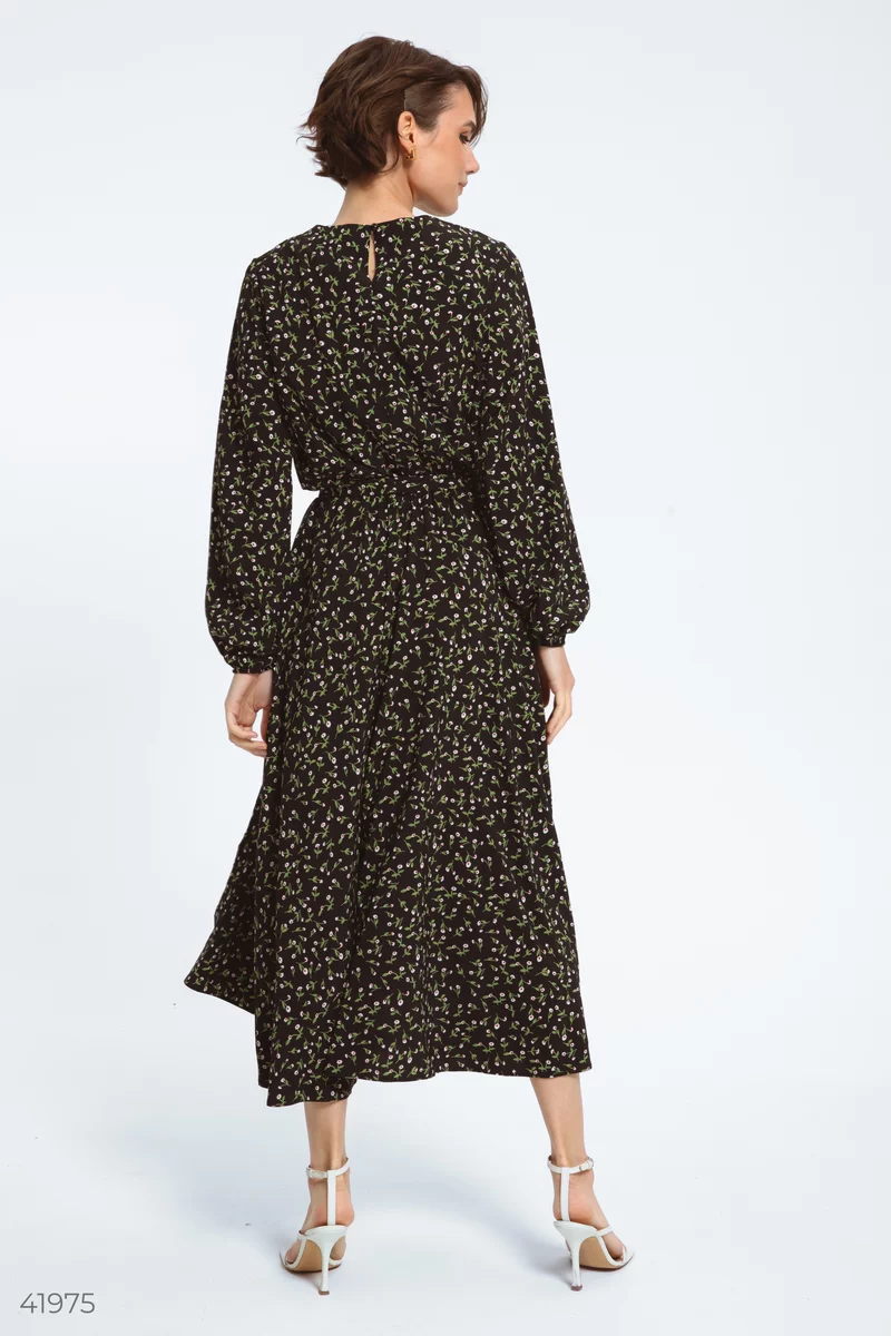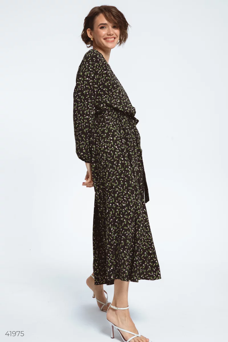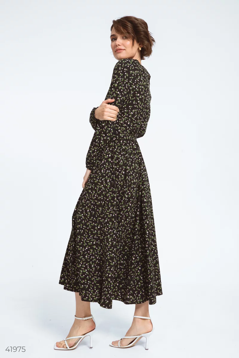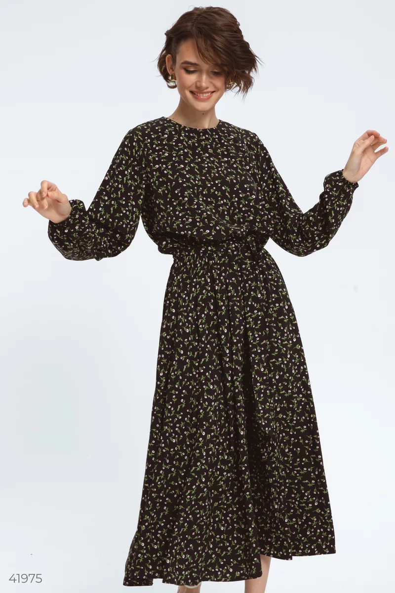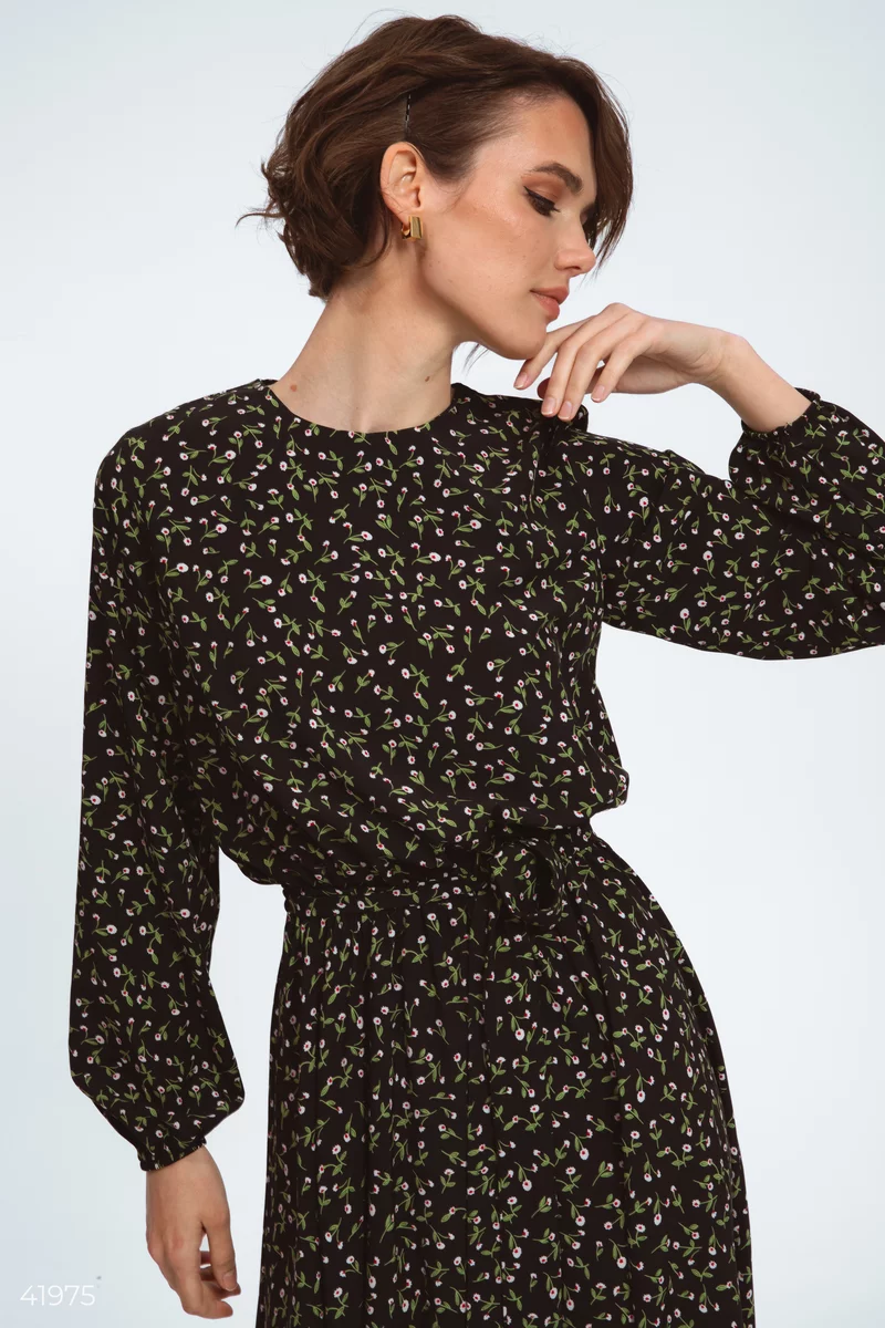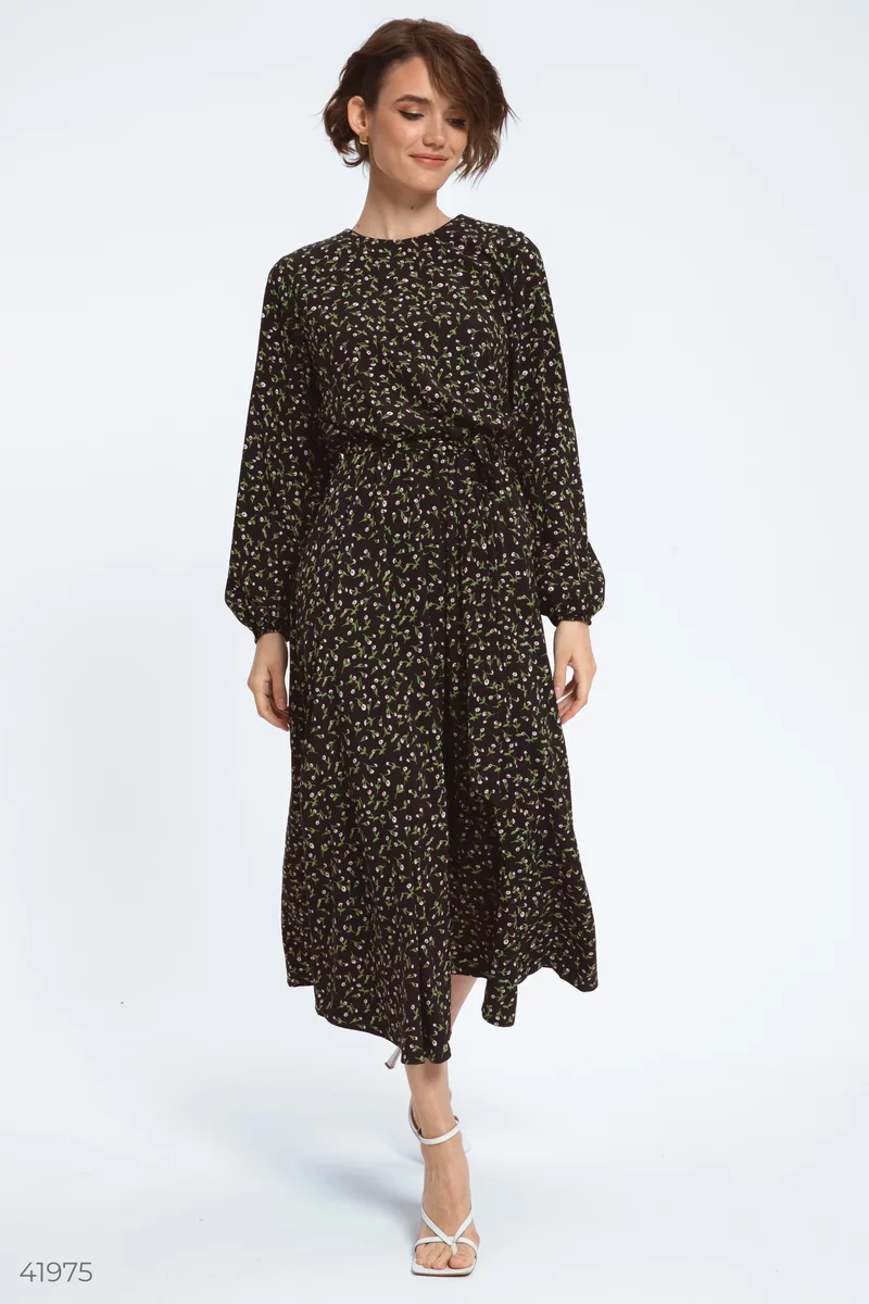 Легкое весеннее платье, выполненное из мягкой ткани в цветочный принт. Аккуратный круглый вырез, пышный рукав с эластичными вставками, и пояс-лента в тон платью. Платье хорошо сочетается, как с классическими туфлями-лодочками, так и с лоферами.