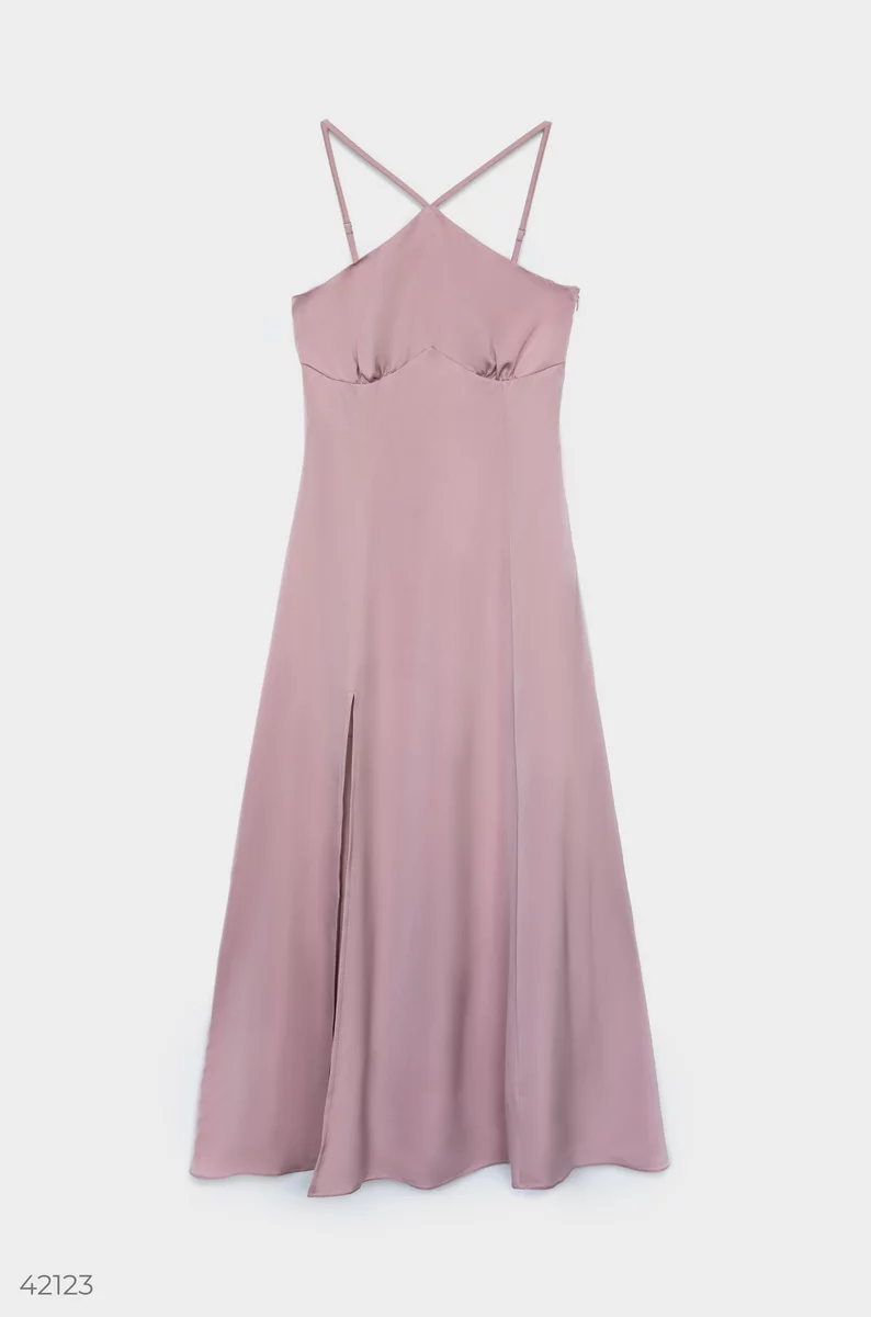 Элегантное платье на тонких бретелях от дизайнеров Gepur. Нежный струящийся шелк розового оттенка придает модели особую нежность. Пришивная расклешенная юбка с глубоким разрезом, и открытая спинка подчеркивают оригинальную задумку дизайнеров.