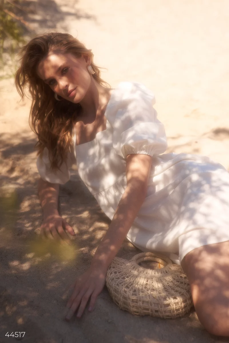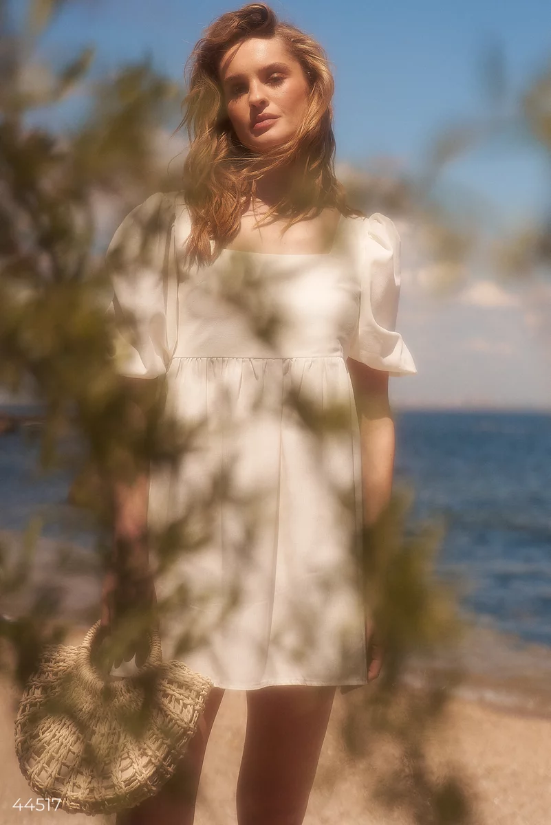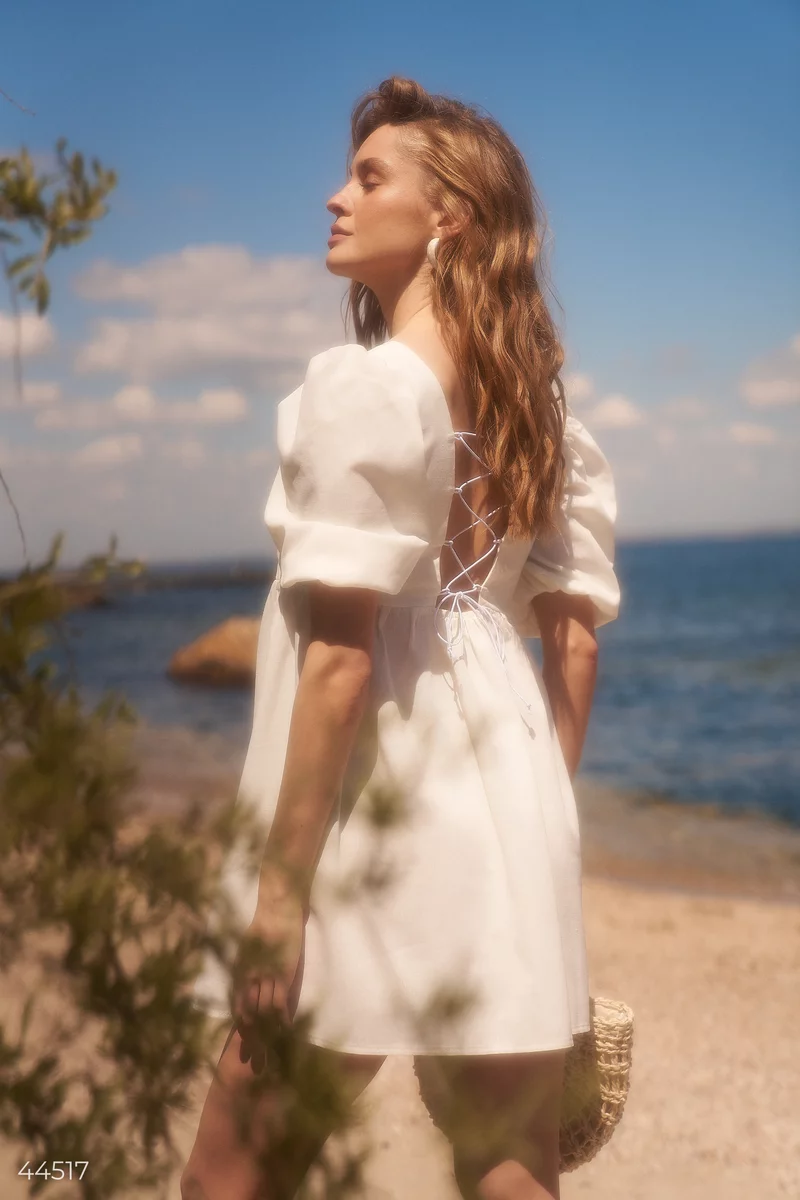 Отрезная завышенная талия, вырез каре и объемный короткий рукав - готовый образ для жаркого летнего дня. Модель выполнена из плотного искусственного льна с матовой фактурой. Застежка на эластичную шнуровку на спинке.