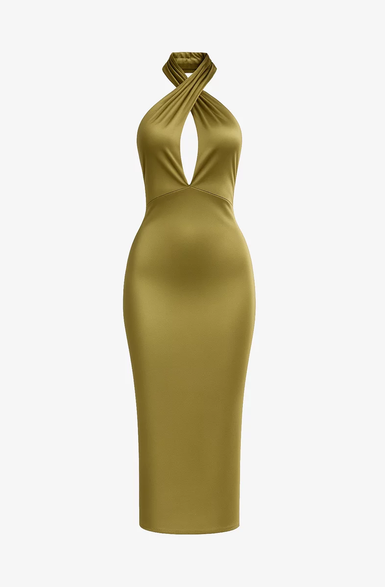 Платье миди облегающего кроя из эластичного бифлекса моделирует силуэт. Акцентное переплетение на лифе эффектно подчеркивает декольте