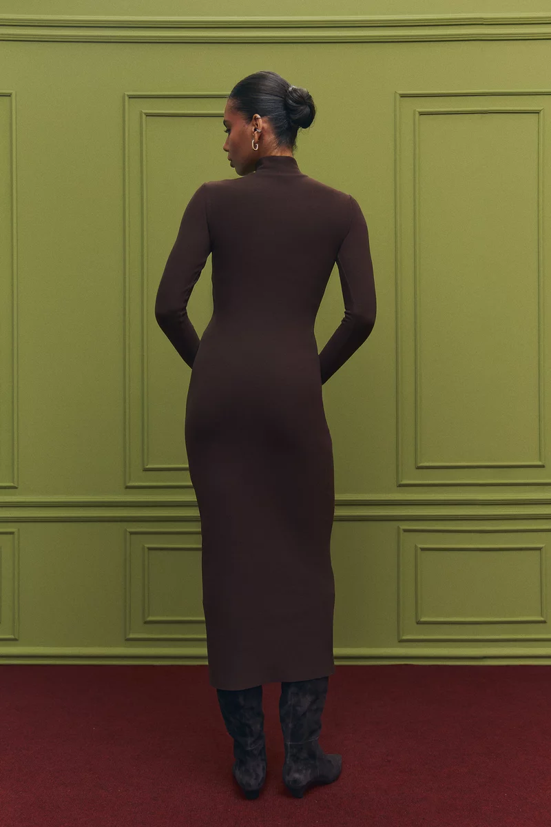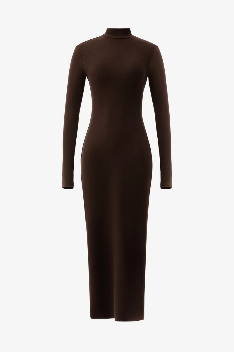 Трикотажное платье макси с воротником-стойкой в шоколадном оттенке