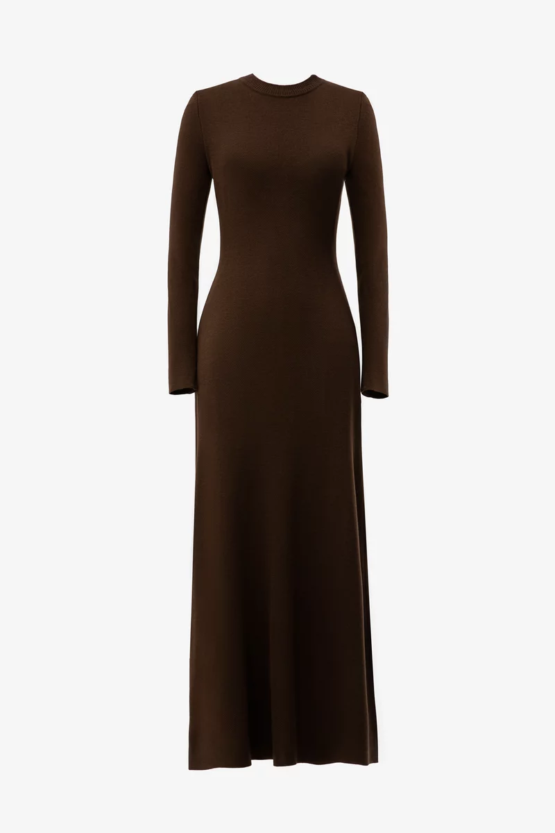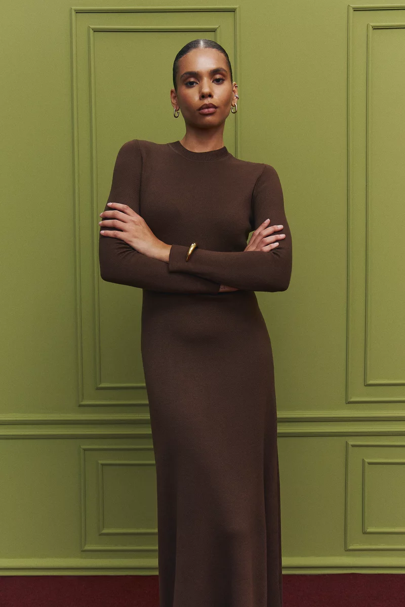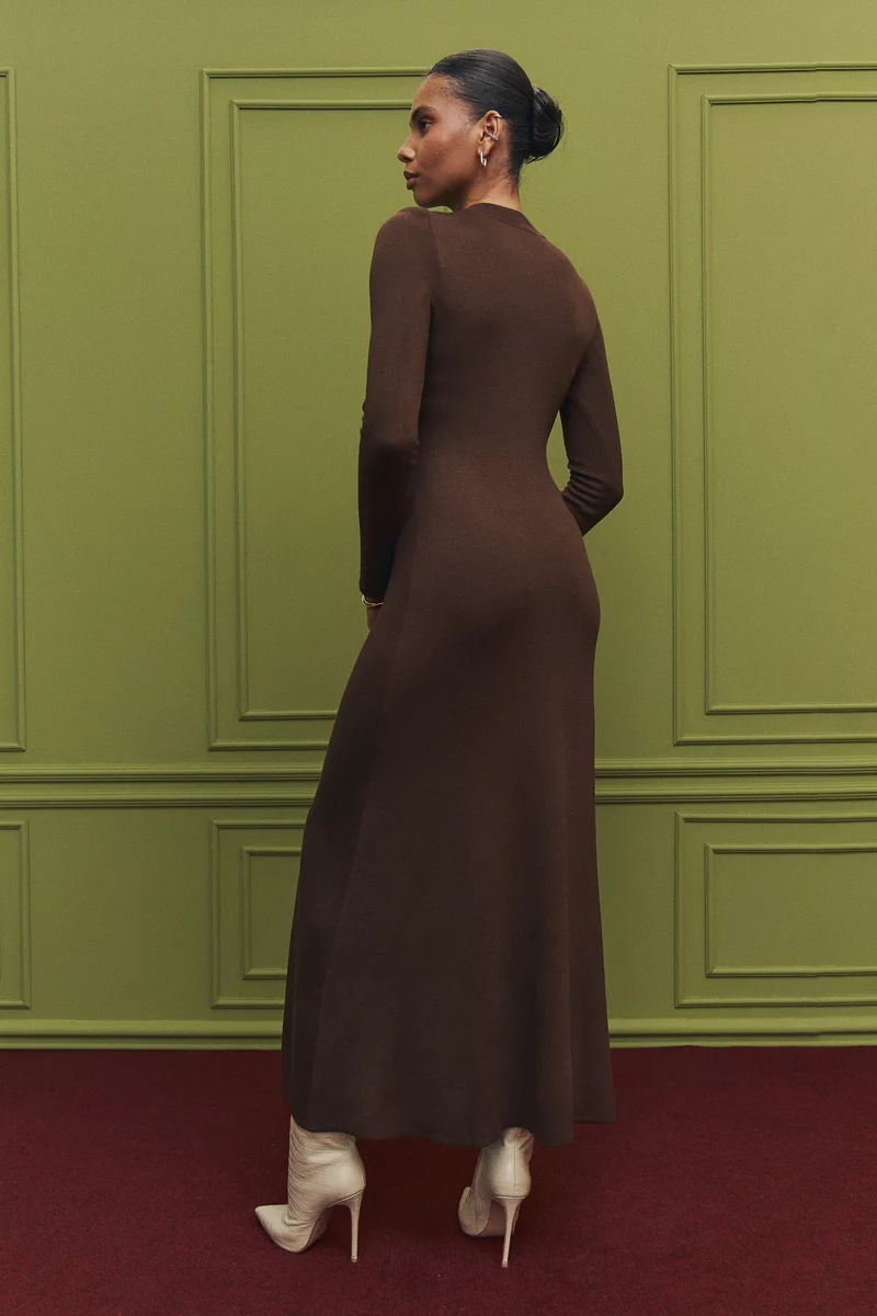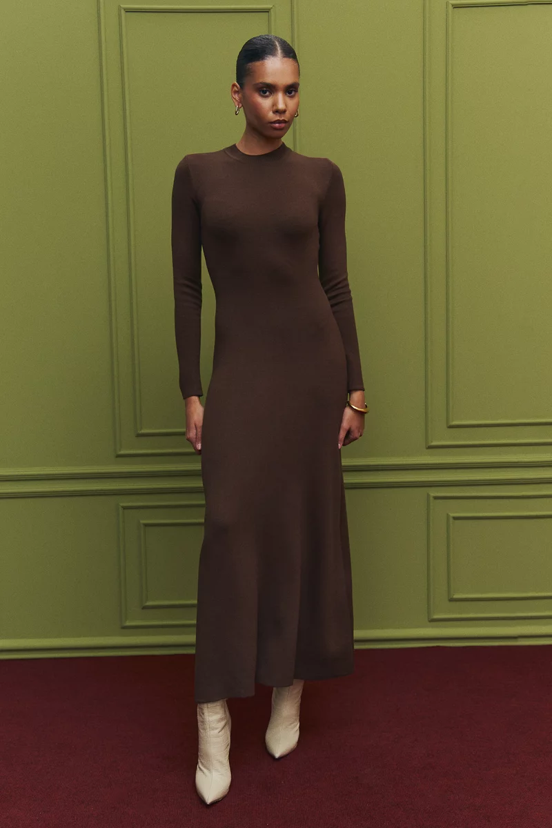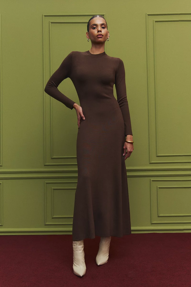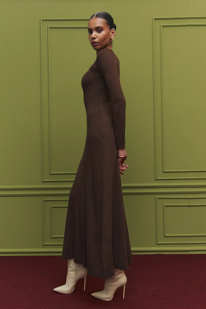 Трикотажное платье миди из мягкого и приятного на ощупь трикотажа. Эффектно моделирует силуэт. Платье с подчеркнутой талией и расклешенной юбкой