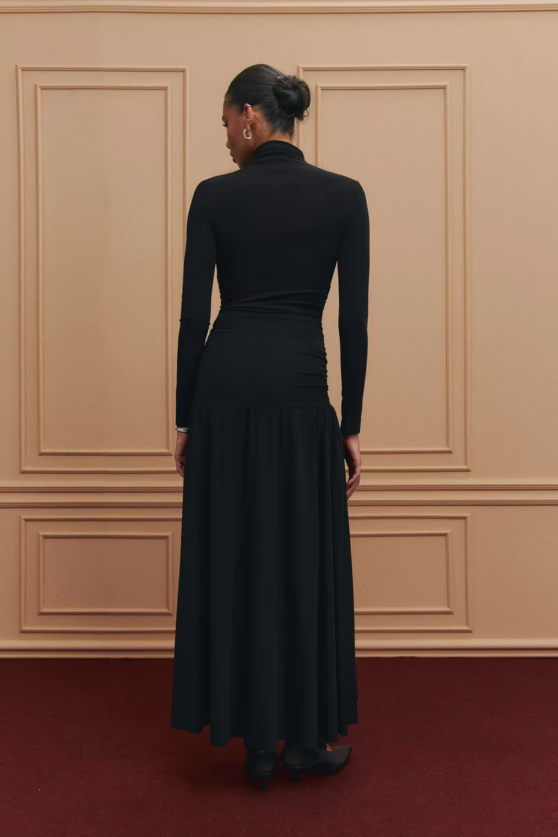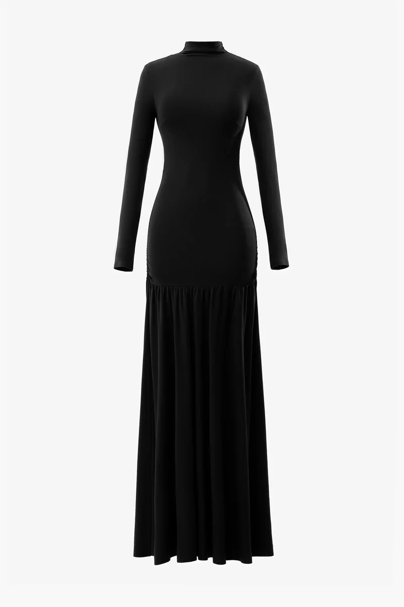 Трикотажное платье макси из мягкого и приятного на ощупь трикотажа. Выточки на лифе, боковая драпировка и расклешенная юбка эффектно моделируют силуэт