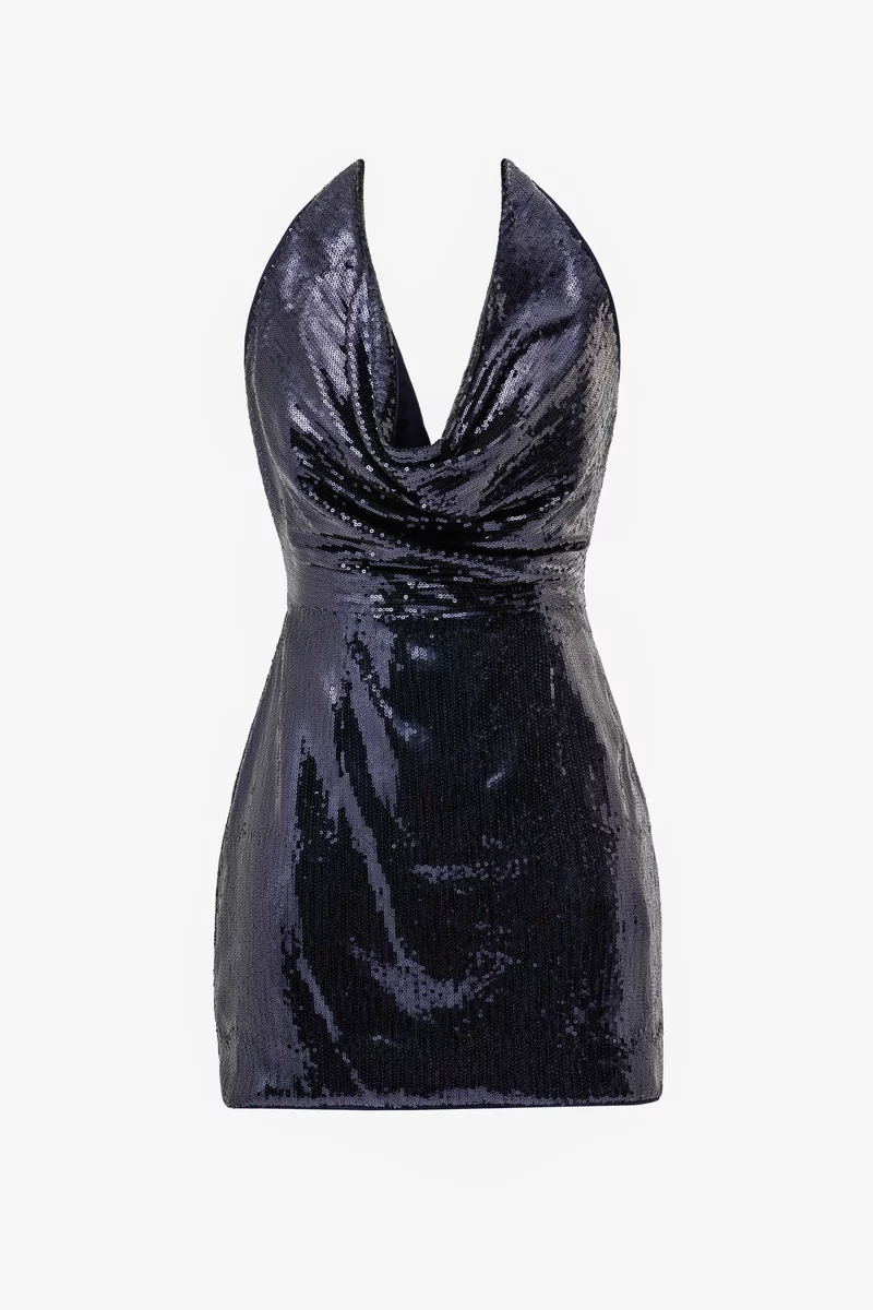 Платье мини с мерцающими пайетками. Эффектный вырез и приталенный крой моделируют силуэт. Застёгивается на тайную молнию в центральном шве спинки. На подкладке