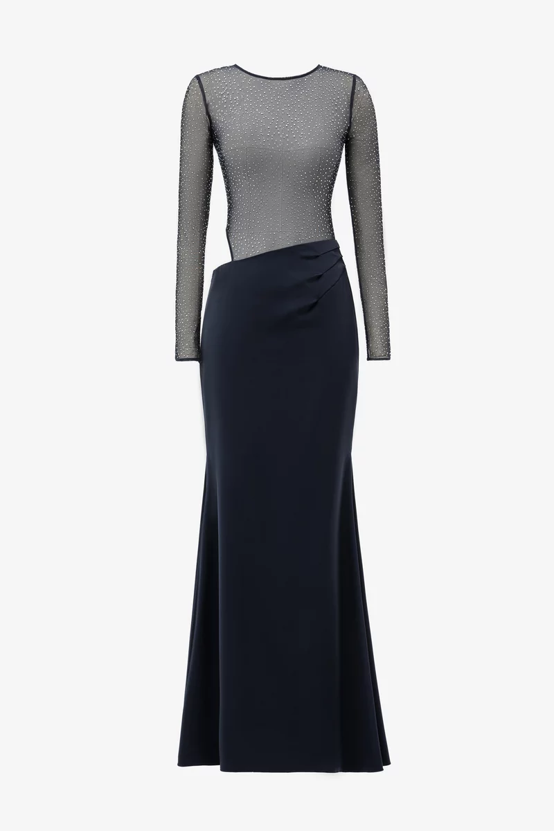 Платье макси из полупрозрачной сетки, стилизованное стразами. Модель асимметричного кроя с боковым вырезом. Сатиновая юбка на подкладке. Застёгивается на скрытую молнию сбоку