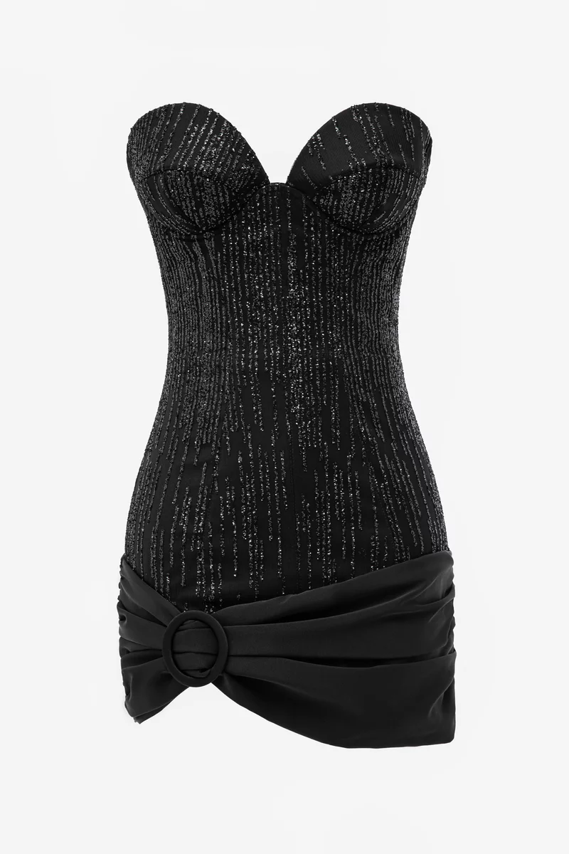 Эффектное платье мини из сетчатого материала с мерцающим декором. Приталенный крой с подчеркнутой талией и лиф на косточках моделирует силуэт. Застегивается на тайную молнию в центральном шве спинки