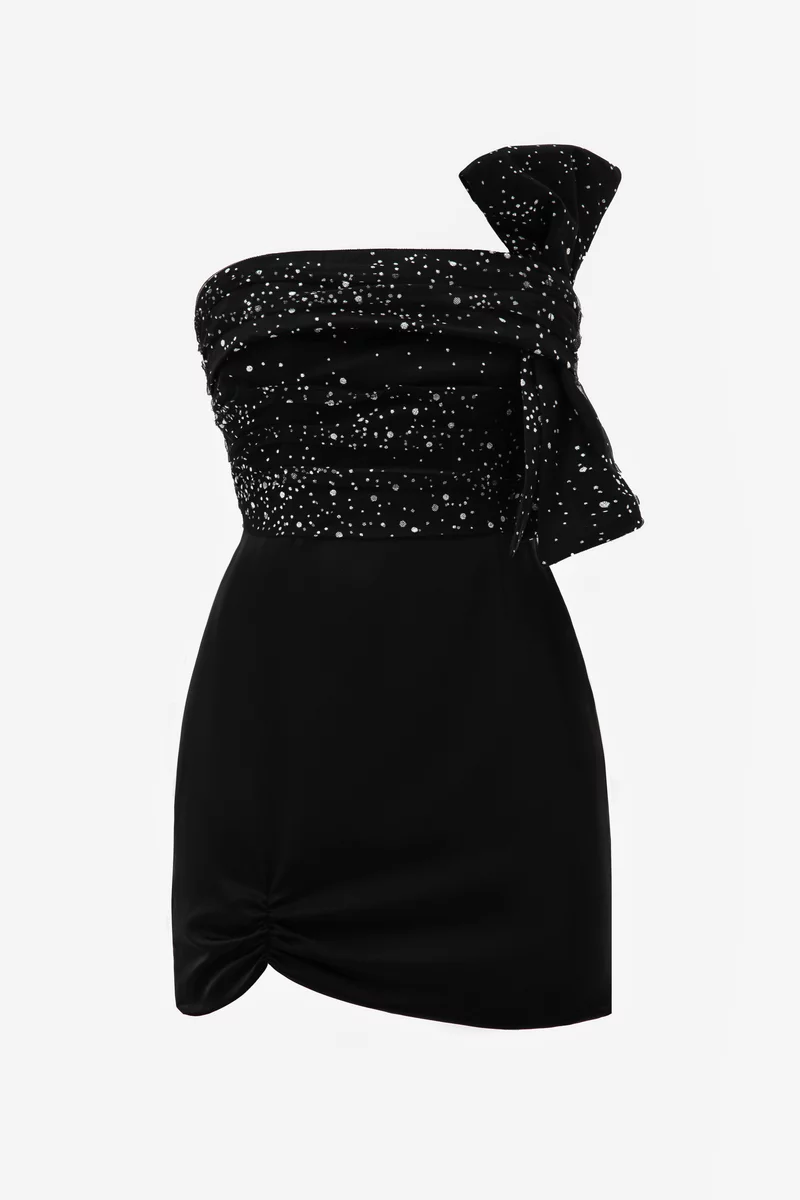 Соблазнительное платье мини с акцентным мерцающим лифом. Подчеркнутая талия. Застёгивается на скрытую змейку сзади.
