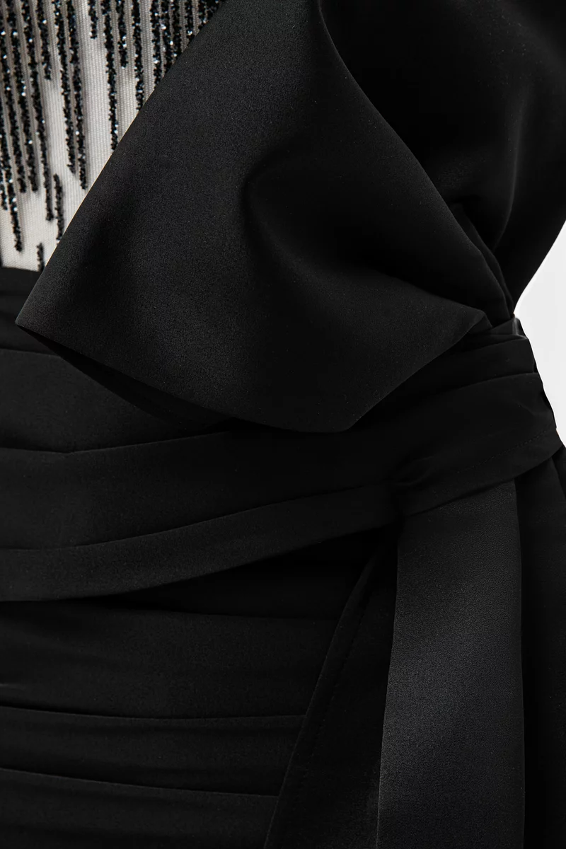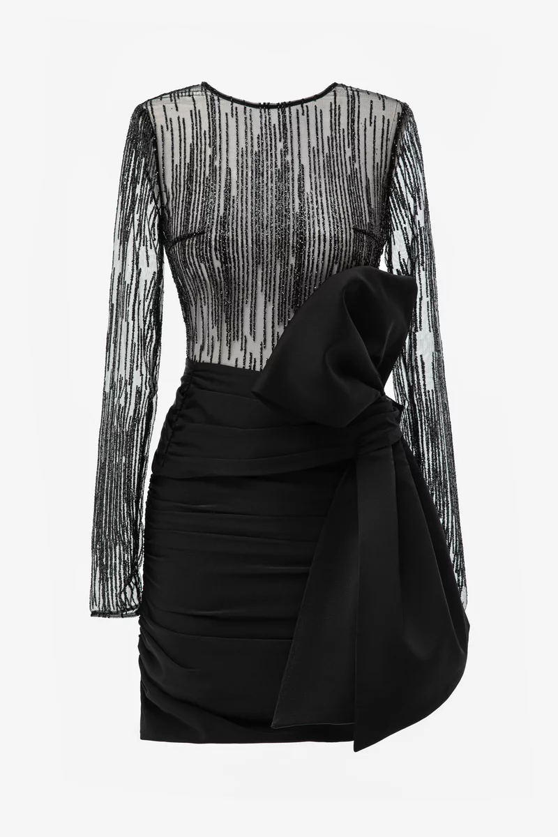 Эффектное платье мини из сетчатого материала с мерцающим декором. Акцентная деталь – съемный пояс-бант для стилизации образа. Сатиновая юбка на подкладке. Застегивается на скрытую молнию сзади