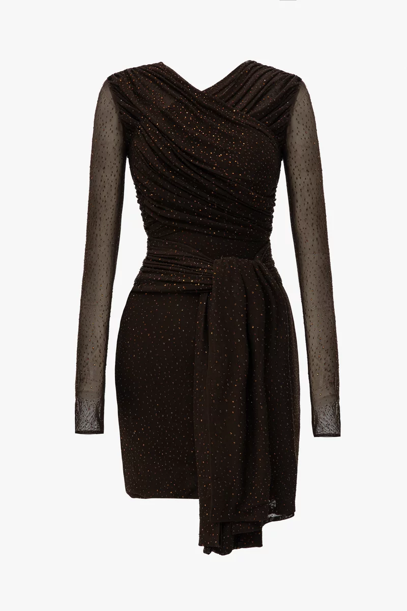 Платье мини из полупрозрачной сетки, стилизованное стразами. Модель с акцентной драпировкой на лифе. Платье на подкладке. В комплекте идет широкий пояс-лента для стилизации образа