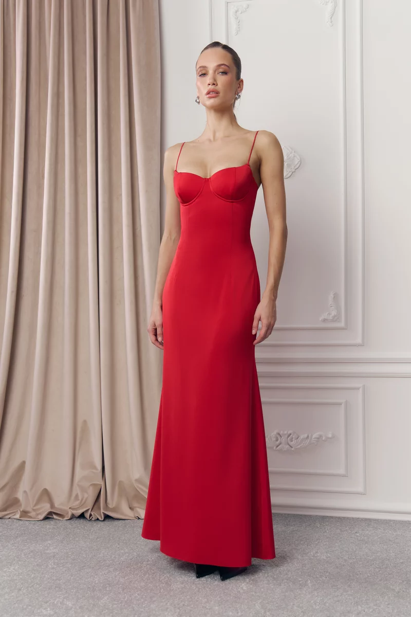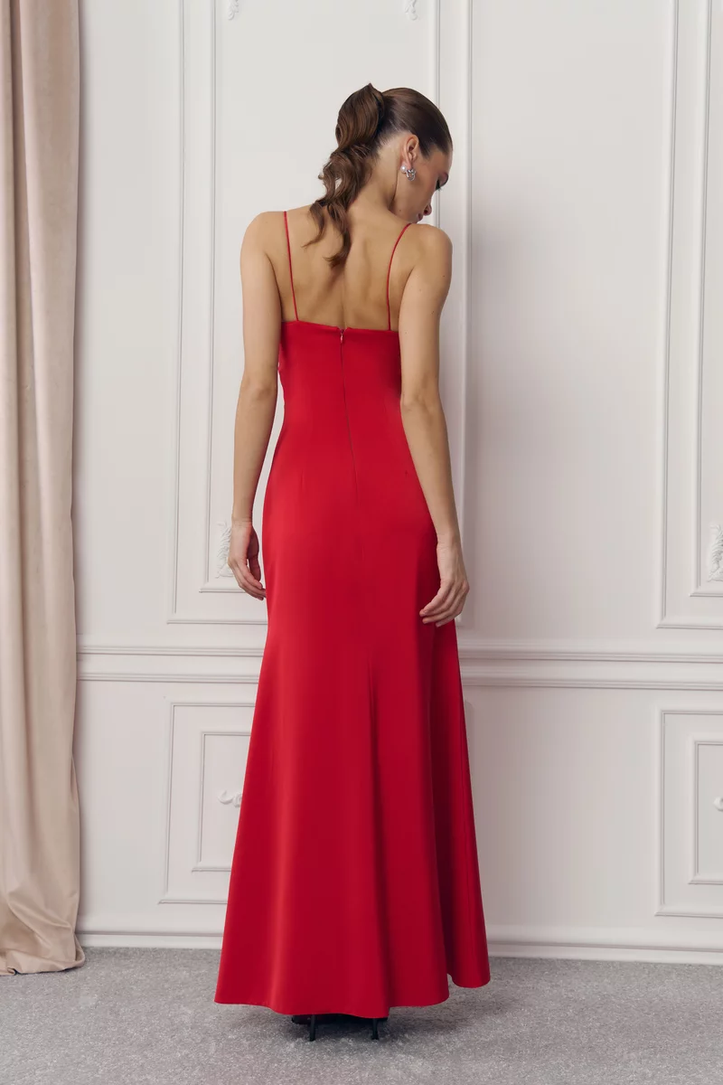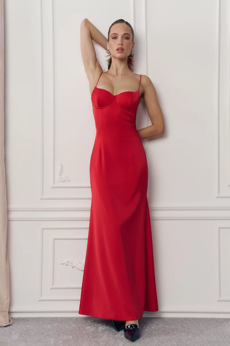 Платье макси из приятного к телу сатина с гладкой фактурой. Лиф с чашками на косточках, подчеркнутая талия и слегка расклешенный крой юбки моделируют изящный силуэт. Модель на тонких бретелях. Застёгивается на скрытую молнию сзади. На сатиновой подкладке